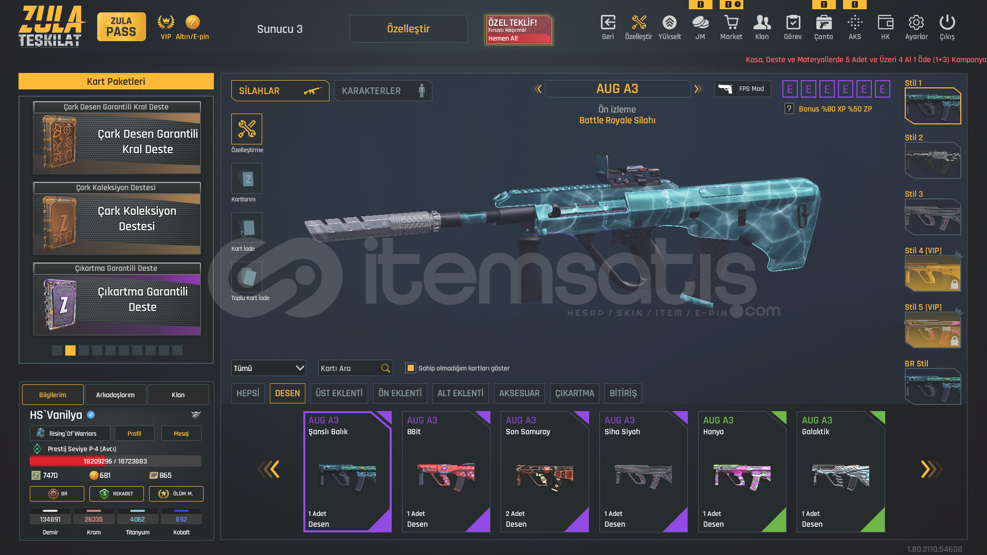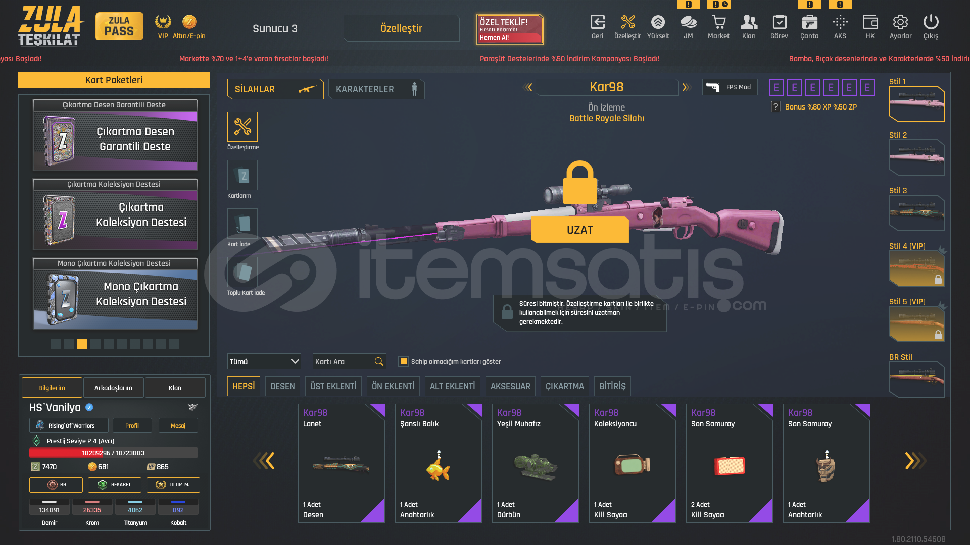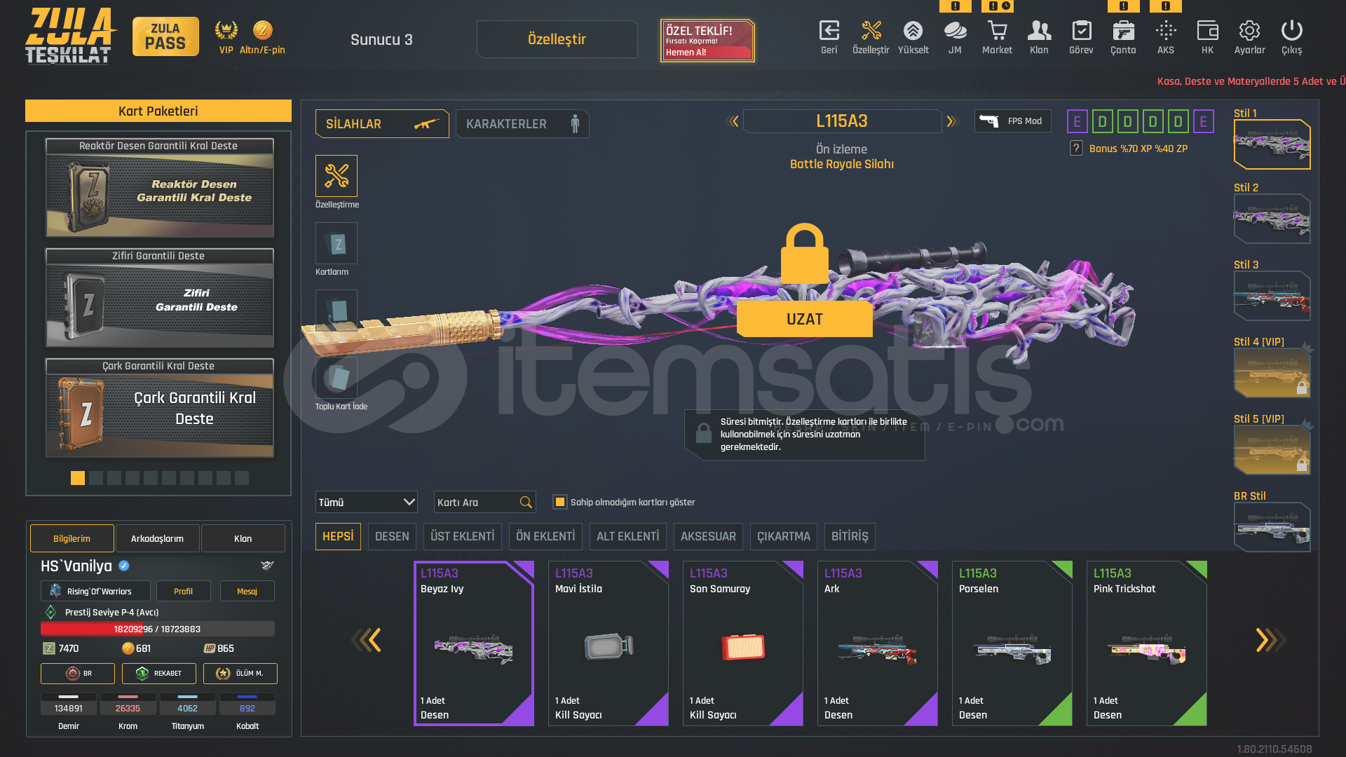 P-4DOLULAR DOLUSU !1x Takma 1x İstatistik Sıfırlama11 Sınırsız Sprey⭐USTURA(SINIRSIZ)⭐⭐KELEBEK(SINIRSIZ)⭐⭐TEPME AZALTICI(SINIRSIZ)⭐⭐AUG A3 +7 (FULL ŞANSLI BALIK-SON-SAMURAY DESEN-8BİT-HANYA)⭐⭐KAR 98 +7 (LANET-HANYA-PİNKY)⭐⭐MPT 76 (BEYAZ IVY-8BİT-ALTIN USTASI-MAVİ İSTİLA-GOTİK-MOR POP-ZİFİRİ-BEYAZ GÜÇ-SOKAK)⭐⭐RS...