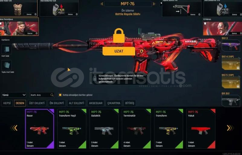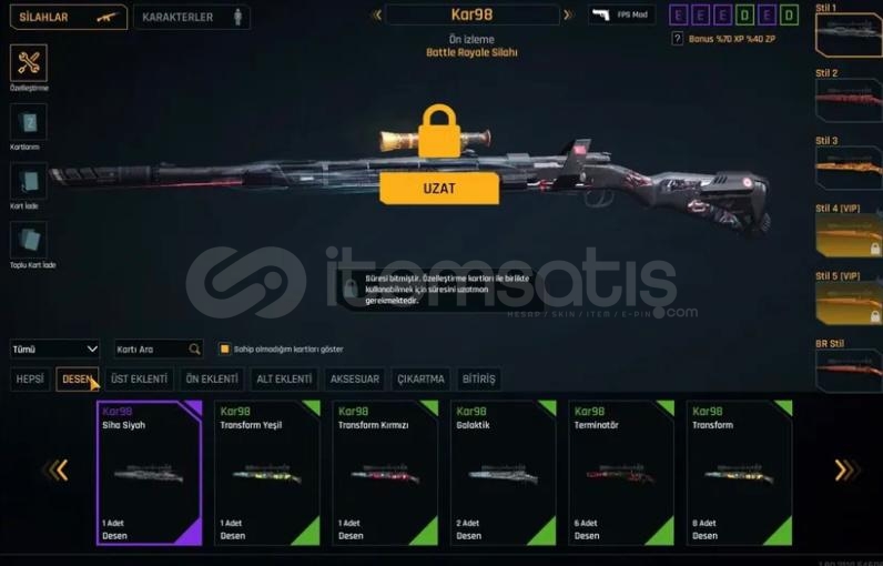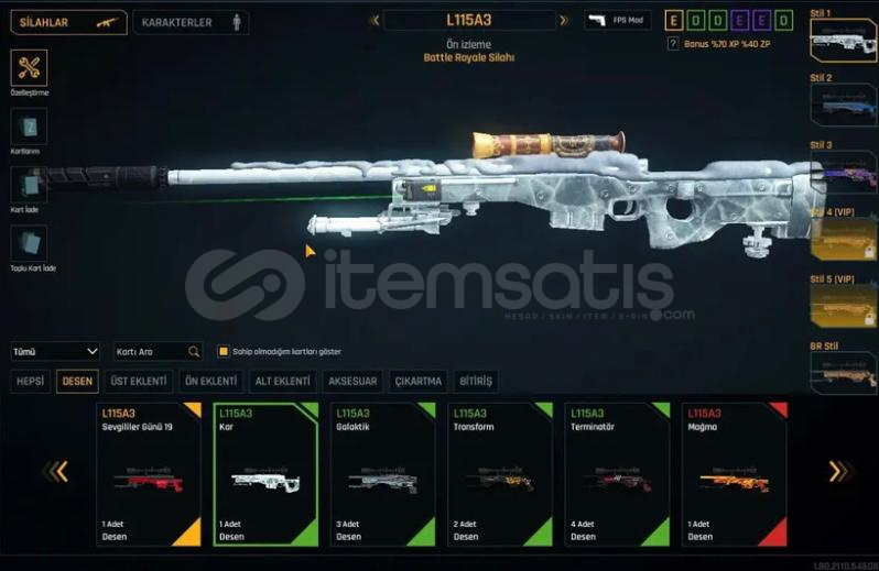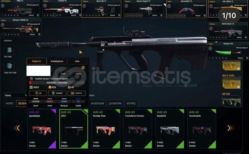 SEVİYE : T10 (%4) REKABET RANK : ZÜMRÜT (%54) ÖLÜM MAÇI RANK : ALTIN (%6) K/D : 1.25MAÇ SAYISI : 2960 EŞSİZ SEV.19 DESENLERİEŞSİZ KATANA DESENLERİ ELİT ÇANAKKALE DESENLERİ ELİT ON BİR AY DESENLERİELİT SİHA TURKUAZ DESENLERİ ELİT ALTIN USTASI DESENLERİ ELİT RACER DESENLERİ ELİT SİHA SİYAH DESENLERİELİT HABERCİ DESENLERİ ELİ...