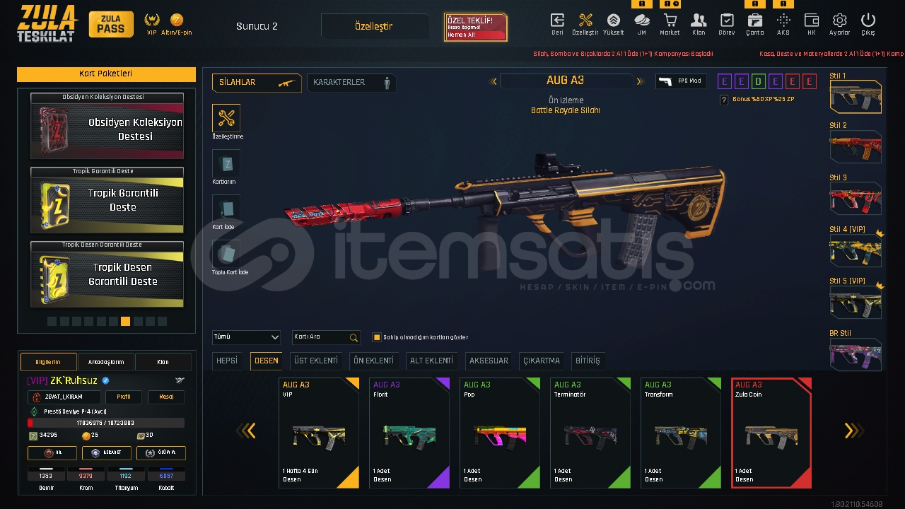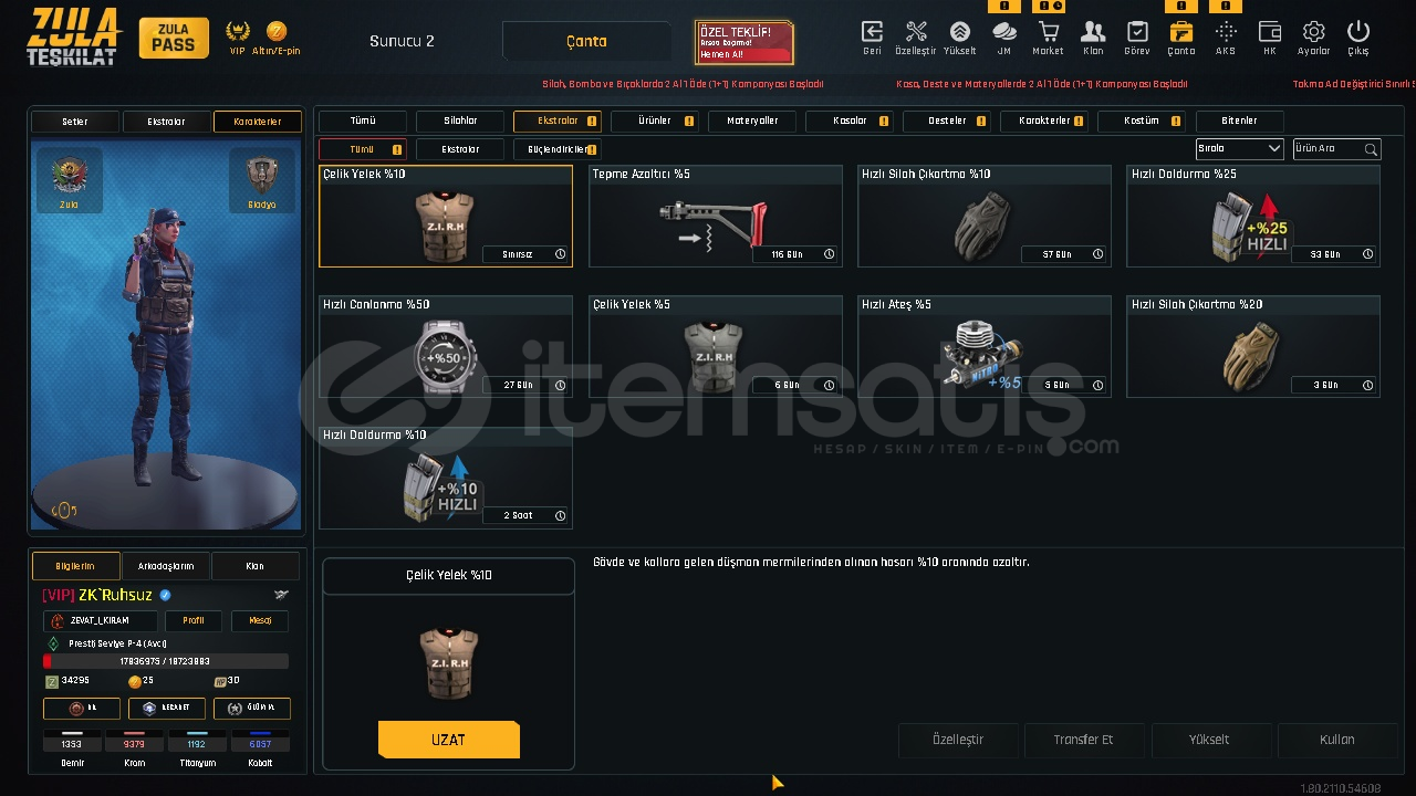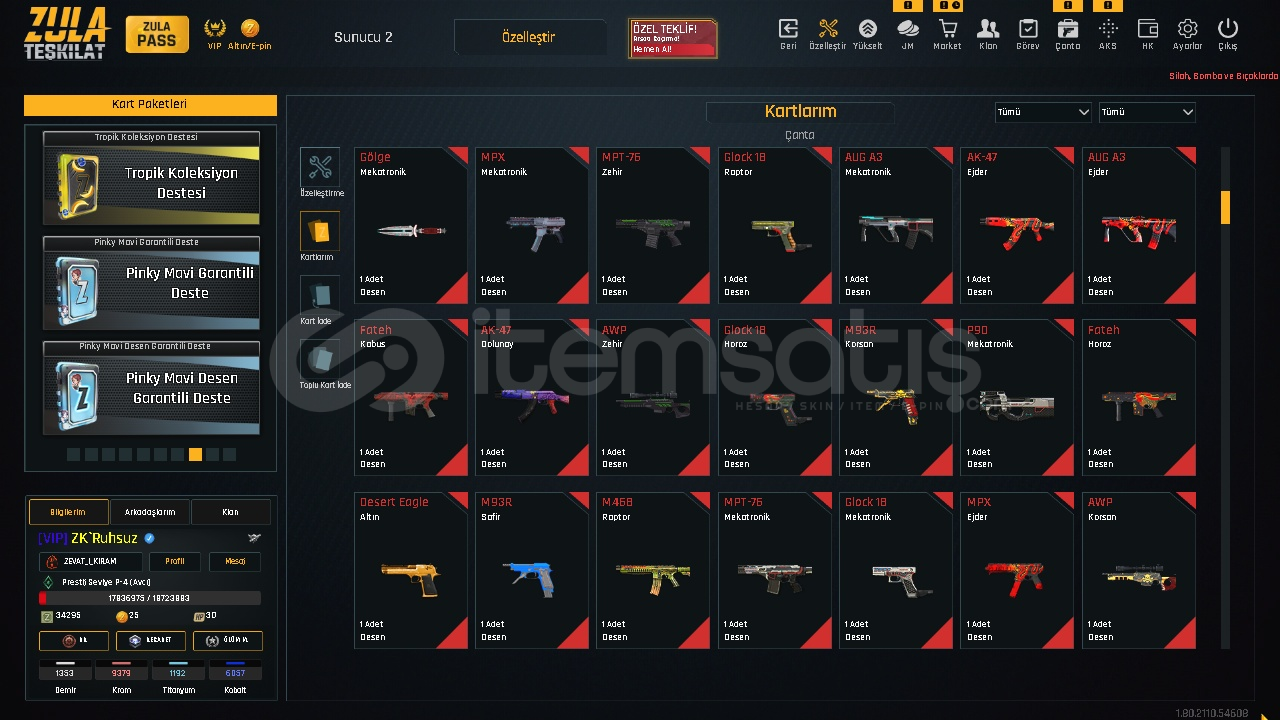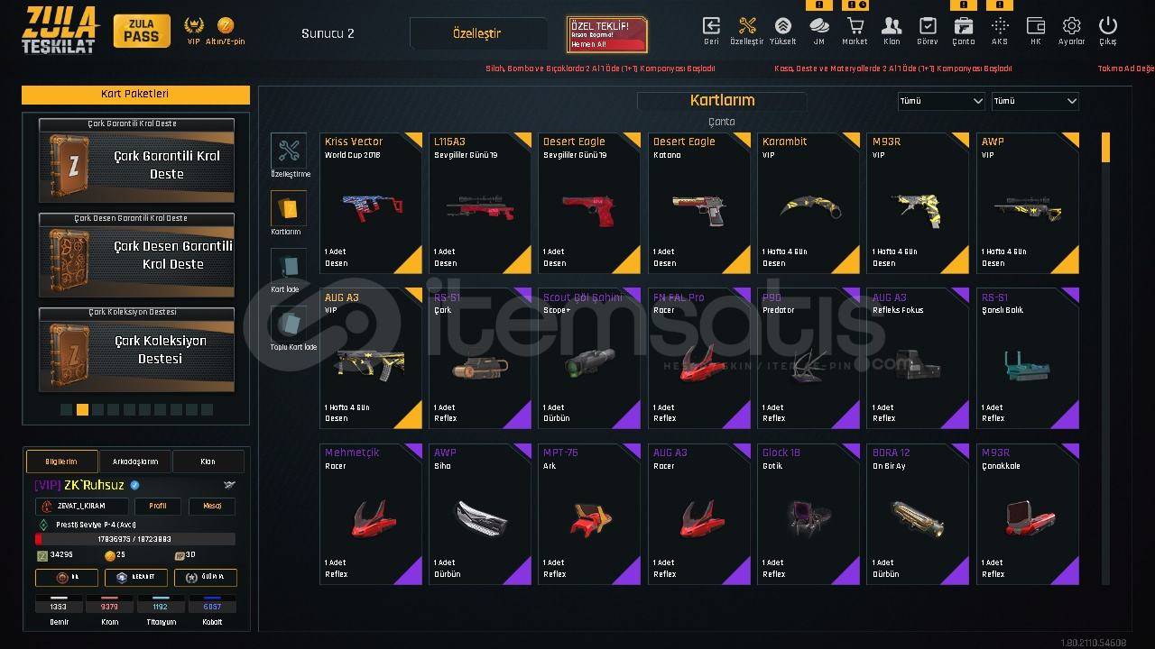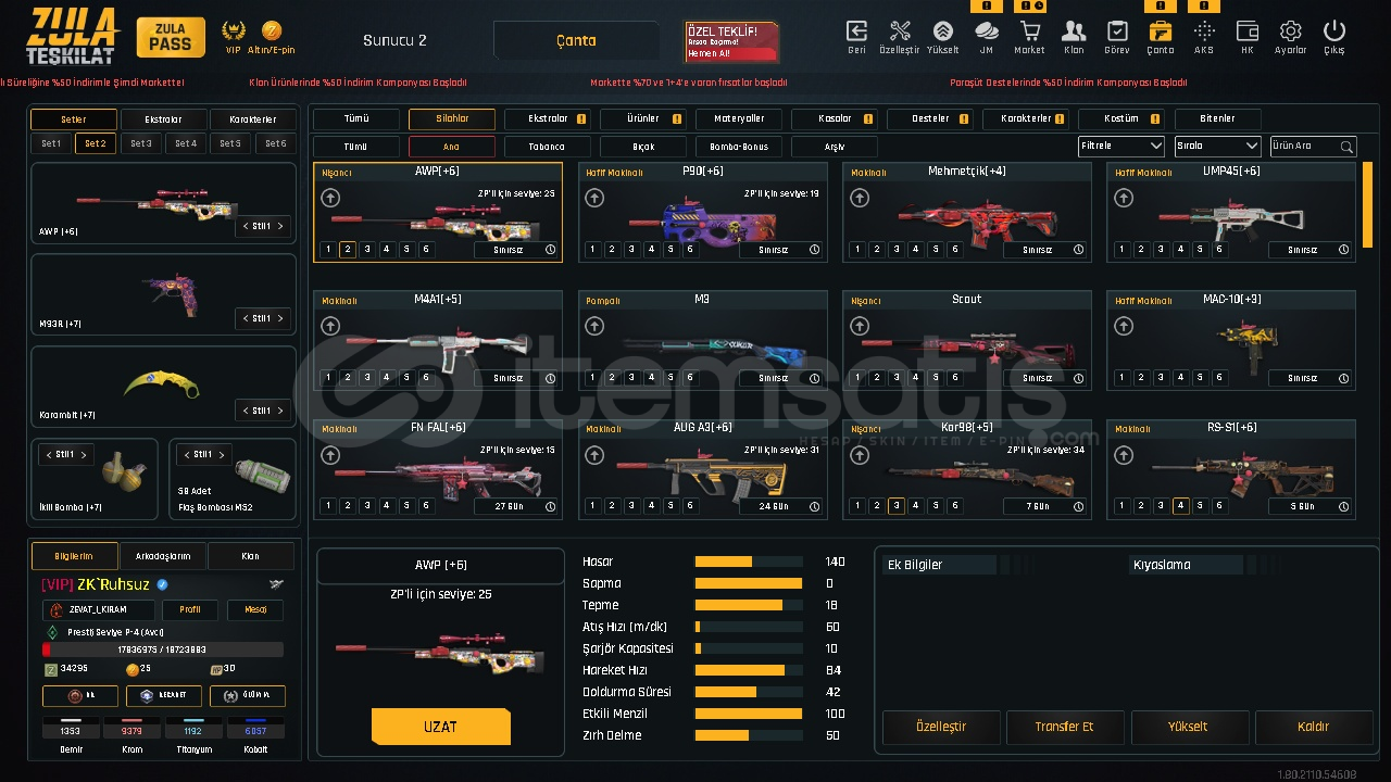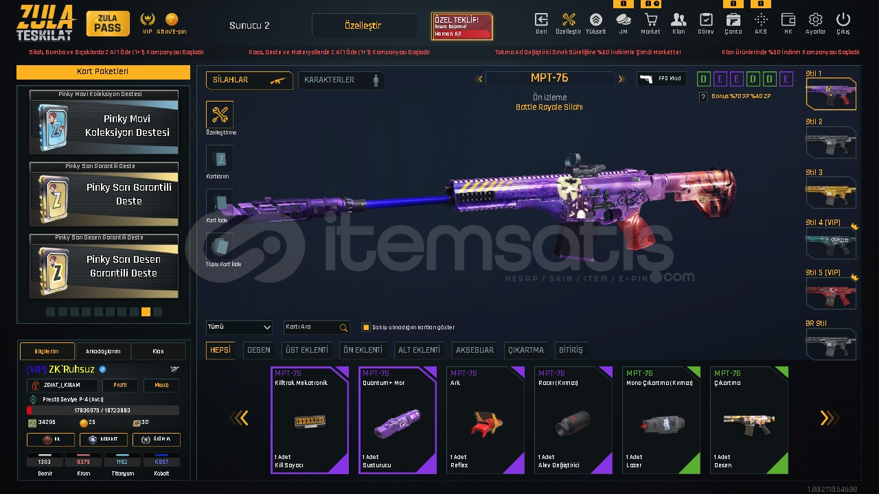 Level P-4Rekabet RankElmasVIP BulunmaktaDemir 5996 Krom18233Titanyum1572Kobalt61358x Eşsiz ve 16x Elit Desenler35x Destansı ve 80x Efsane Desenler Mpt-76 - Quantum+ Mor SIG-552 - Quantum+ Mor Birden Çok Silahta, Birden Fazla Quantum & VandettaKiera Jelani - 42 GünSınırsızlarAWP +6P90 +6Mehmetçik +4Ump45 +6Deagle +6ÇELİK YELEK %10+6/+7 İtemlerFN-FAL +6AUG-A3 +6MPT-76 +7L115A3 +7KAR-98 +5RS-S1 +6M4 SUPE...