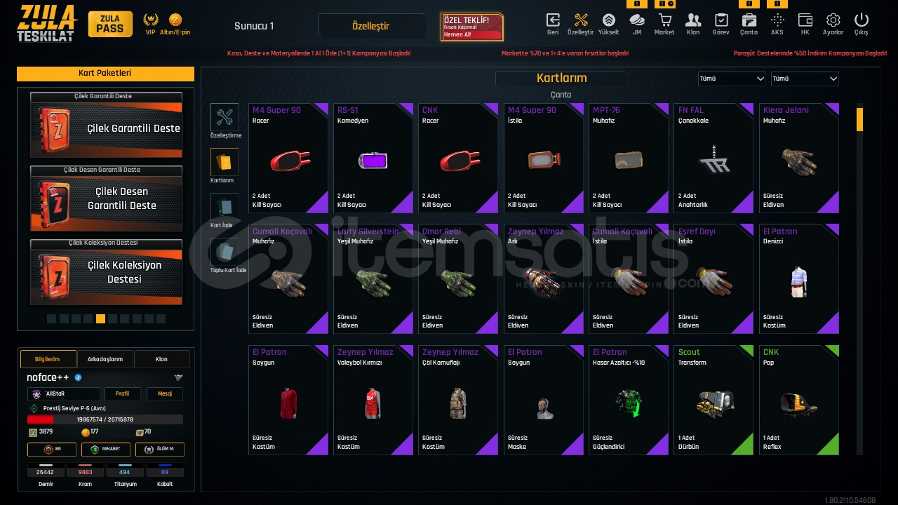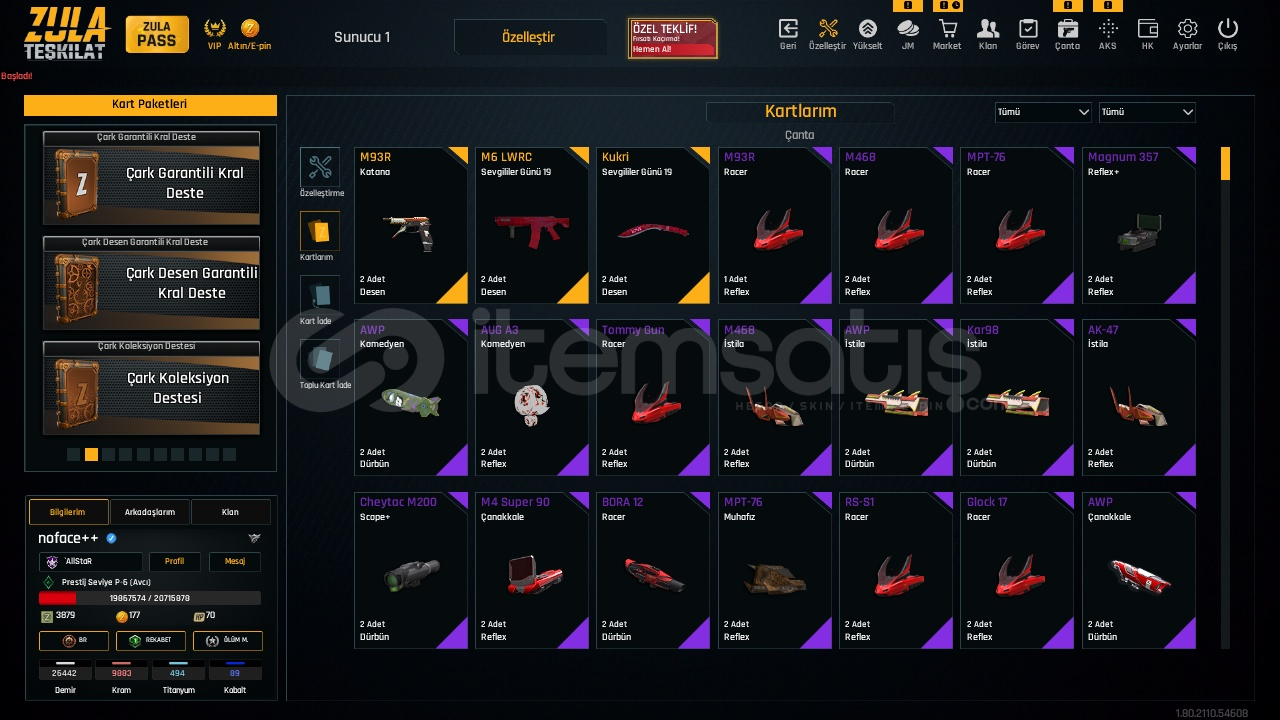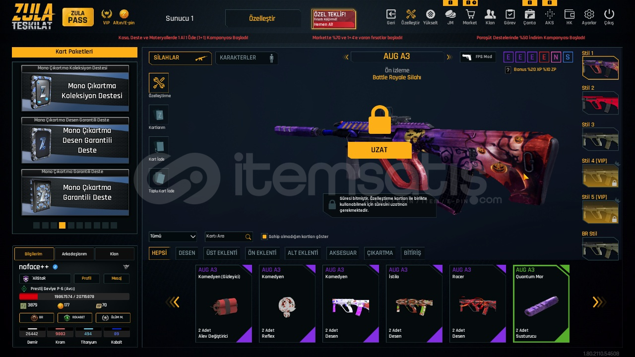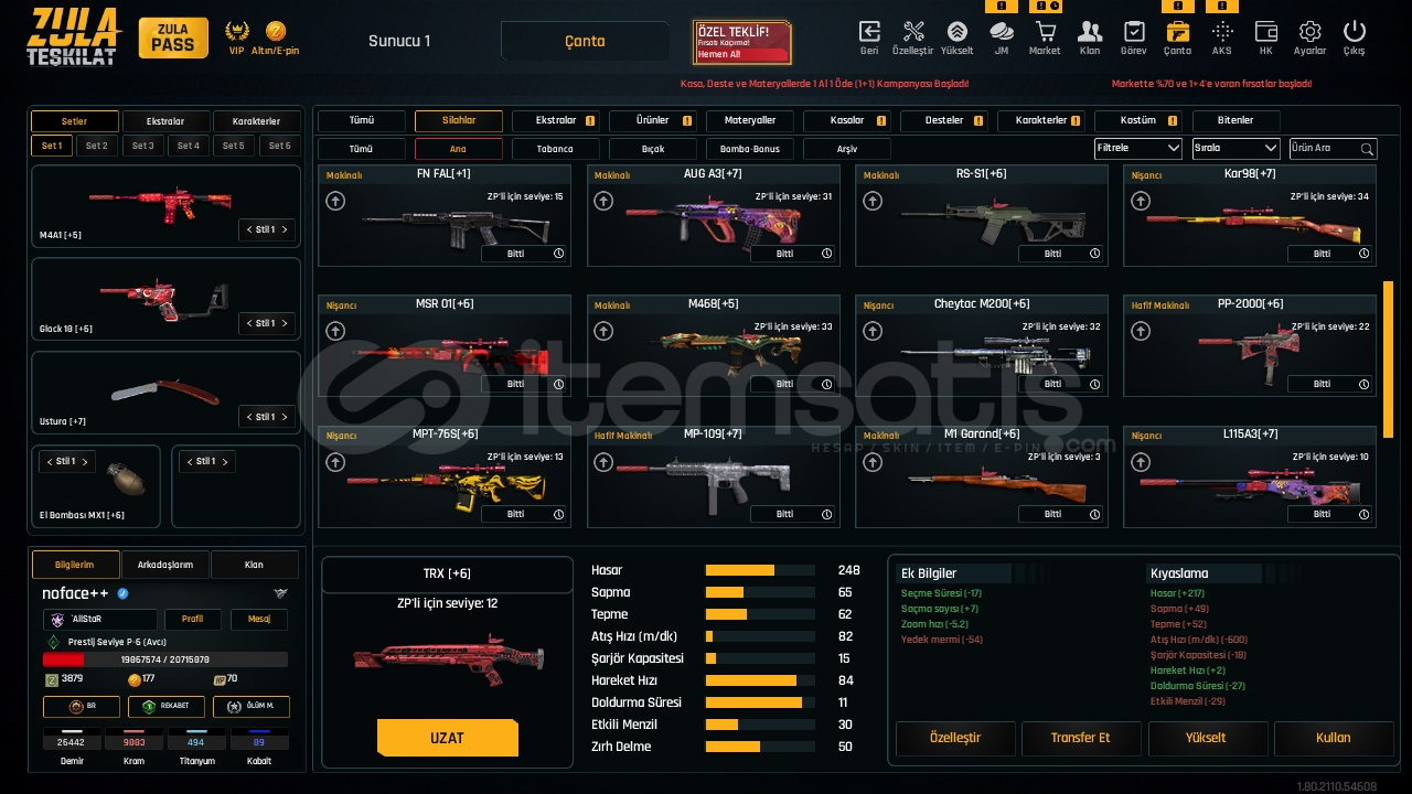 Sınırsızlar;Ustura, Glock18, TRX, Mehmetçik, G36, El Patron, Süresiz Kostümler, Eldivenler, Spreyler, Güçlendirmeler.+7 AUG A3+7 Kar98+7 MPT-76+7 M4 Super 90+7 P90+7 L115A3+7 MP-109+7 İkili C5+7 Kriss Vector+7 M93R+7 Ustura+7 Kelebek+7 İngiliz Anahtarı+6 Cheytac M200+6 PP-2000+6 MSR 01+6 M1 Garand+6 MPT-76S+6 MPX+6 HK-G3+6 XCR-L+6 Mb-7+6 Jop+6 Gölge+6 Muşta+6 Karambit+6 Dikiştutmaz+6 Kurt+6 Huntsman+6 Glock-18+6 Desert Eag...