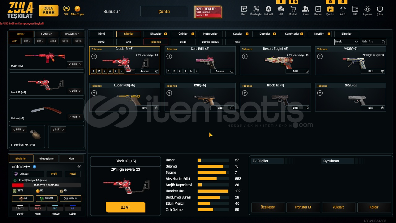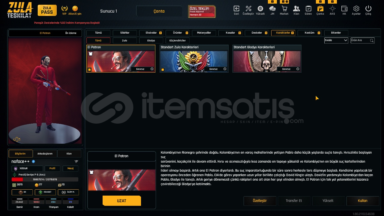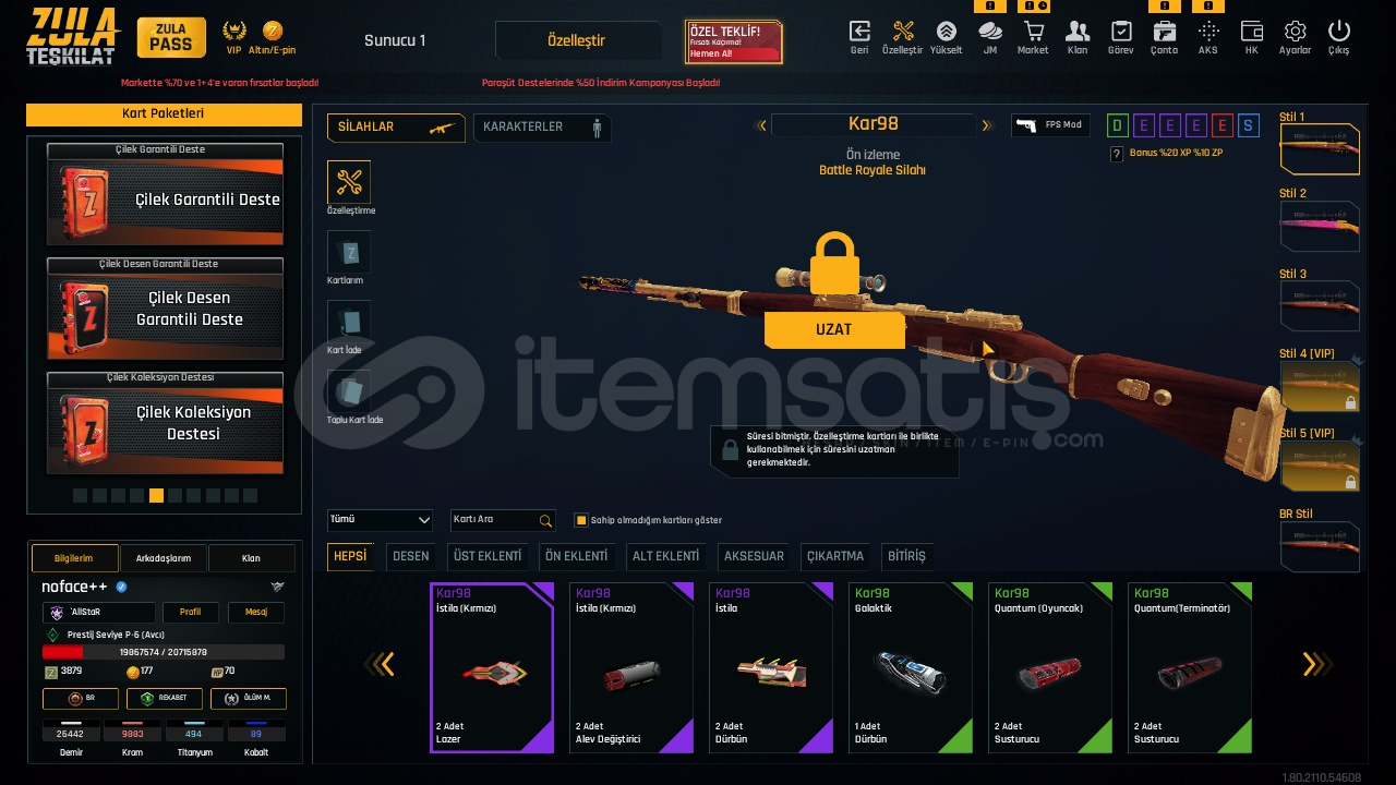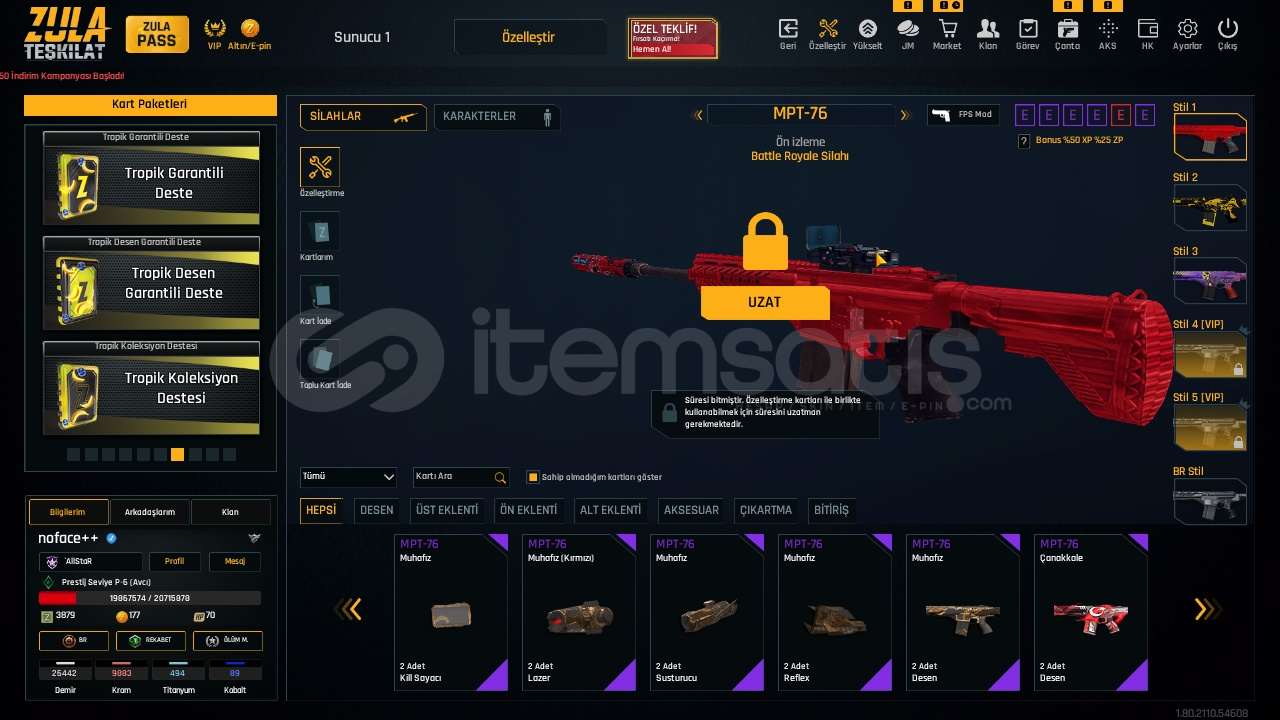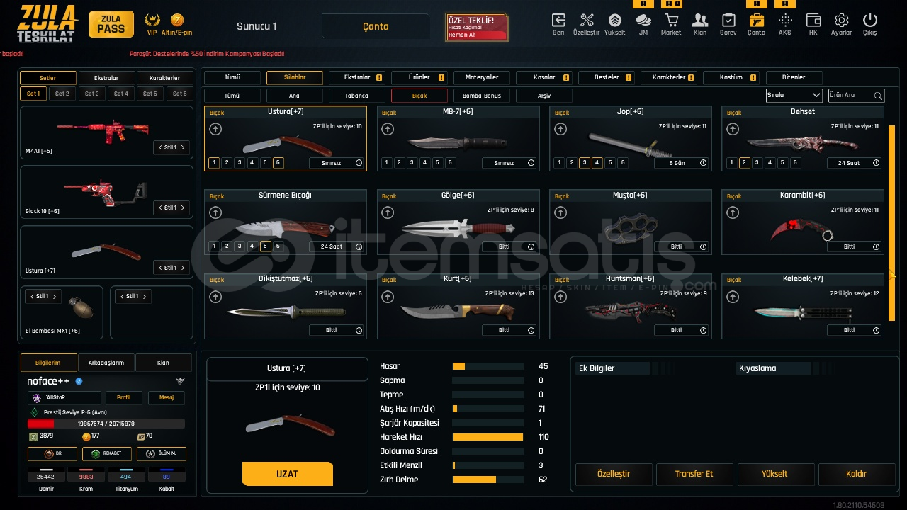 Sınırsızlar;Ustura, Glock18, TRX, Mehmetçik, G36, El Patron, Süresiz Kostümler, Eldivenler, Spreyler, Güçlendirmeler.+7 AUG A3+7 Kar98+7 MPT-76+7 M4 Super 90+7 P90+7 L115A3+7 MP-109+7 İkili C5+7 Kriss Vector+7 M93R+7 Ustura+7 Kelebek+7 İngiliz Anahtarı+6 Cheytac M200+6 PP-2000+6 MSR 01+6 M1 Garand+6 MPT-76S+6 MPX+6 HK-G3+6 XCR-L+6 Mb-7+6 Jop+6 Gölge+6 Muşta+6 Karambit+6 Dikiştutmaz+6 Kurt+6 Huntsman+6 Glock-18+6 Desert Eag...