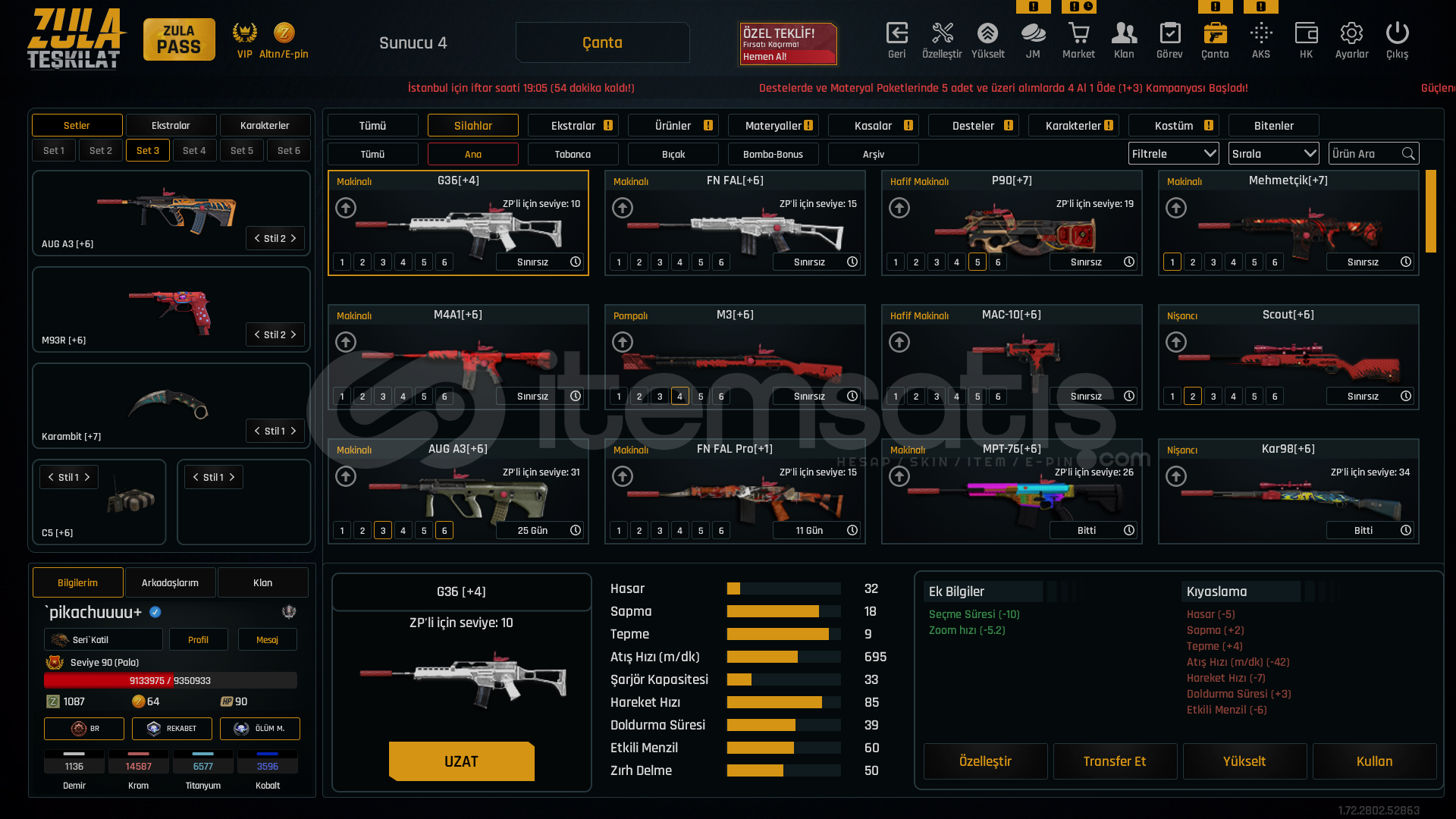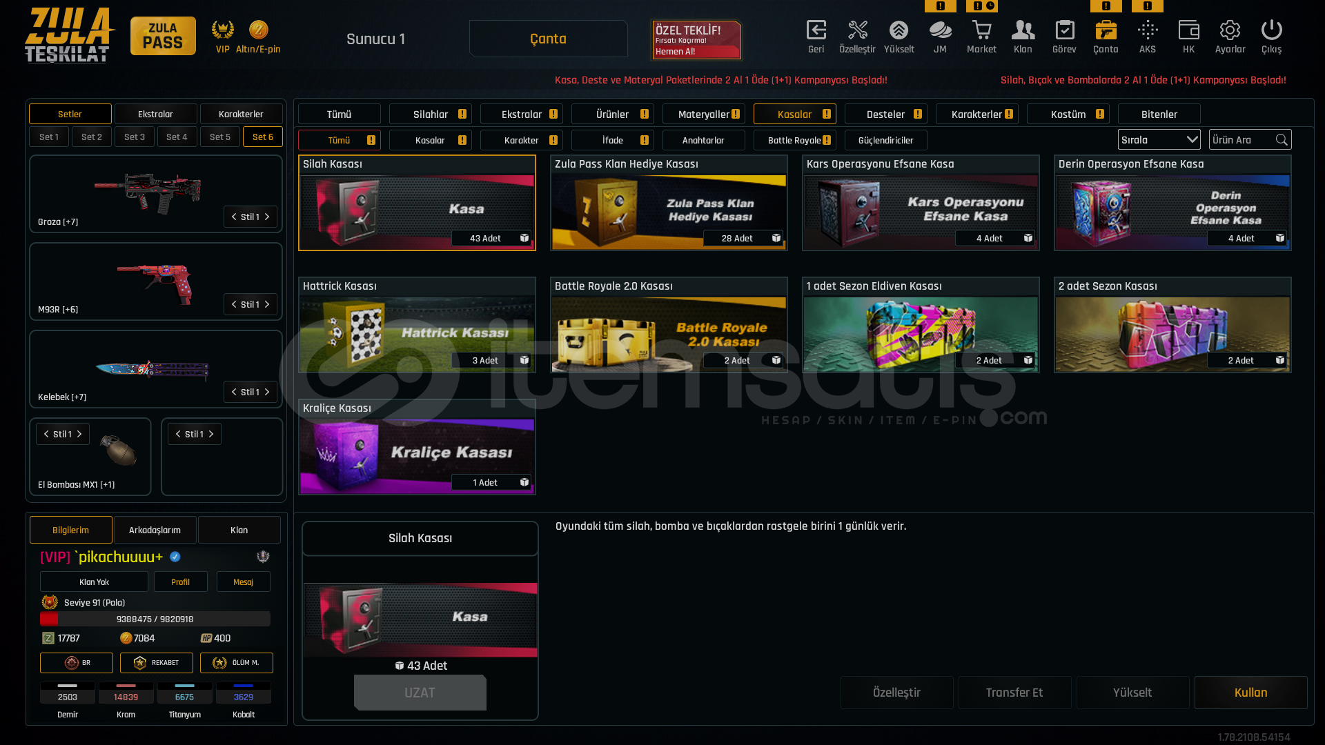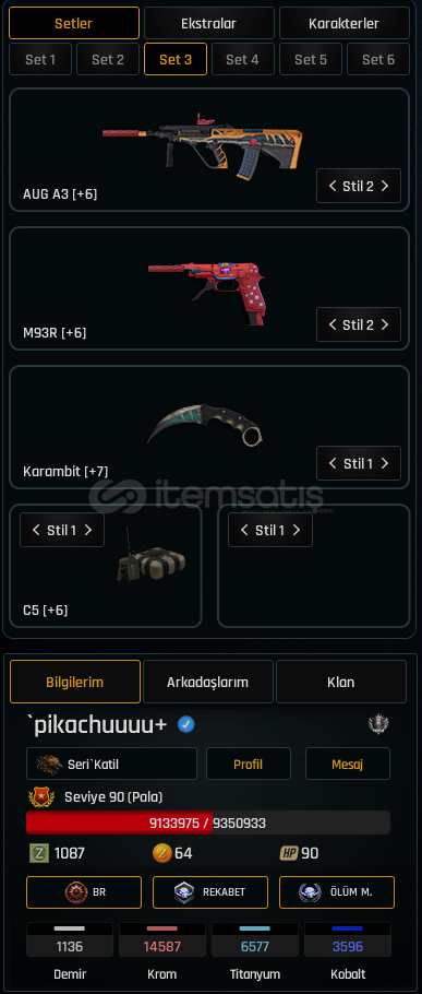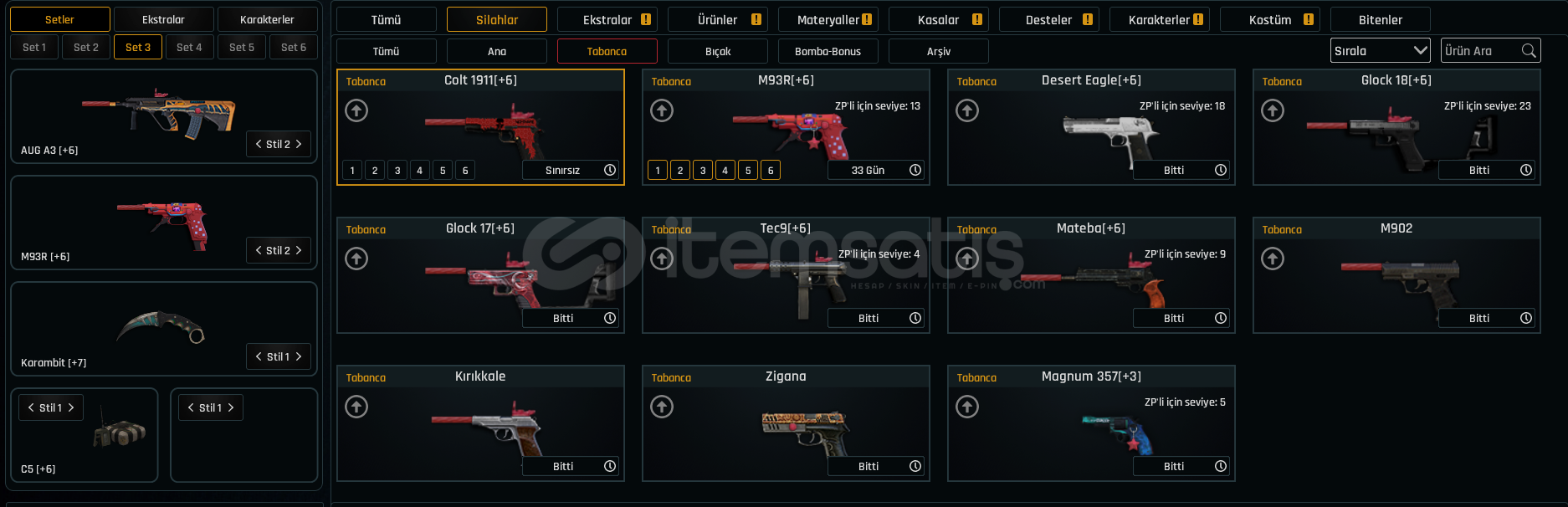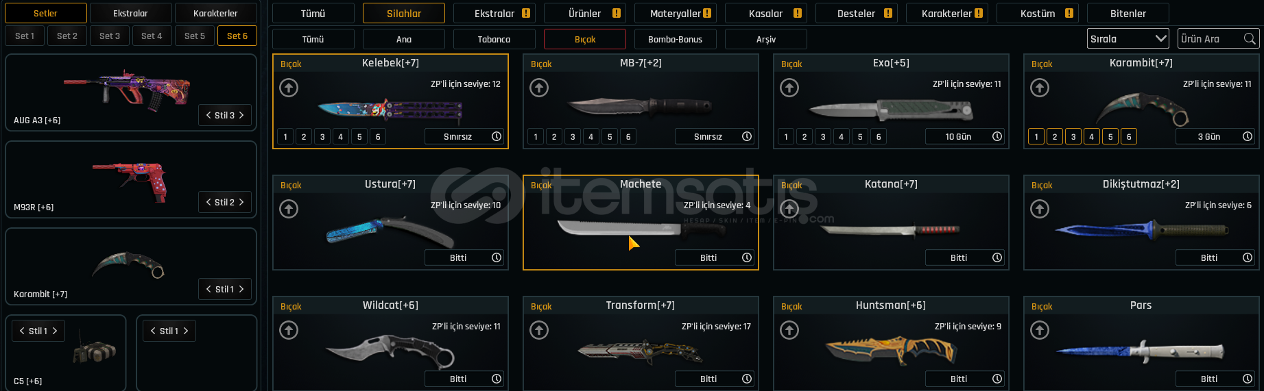 +7 kelebek sınırsız +7 p90 sınırsız+6 fn fal sınırsız+7 mehmetçik ve full +6 dolu hesap bıçaklar full +6 +7 dir acil nakite ihtiyacım olduğu için satıyorum VIP 1 aylık alınmıstır
