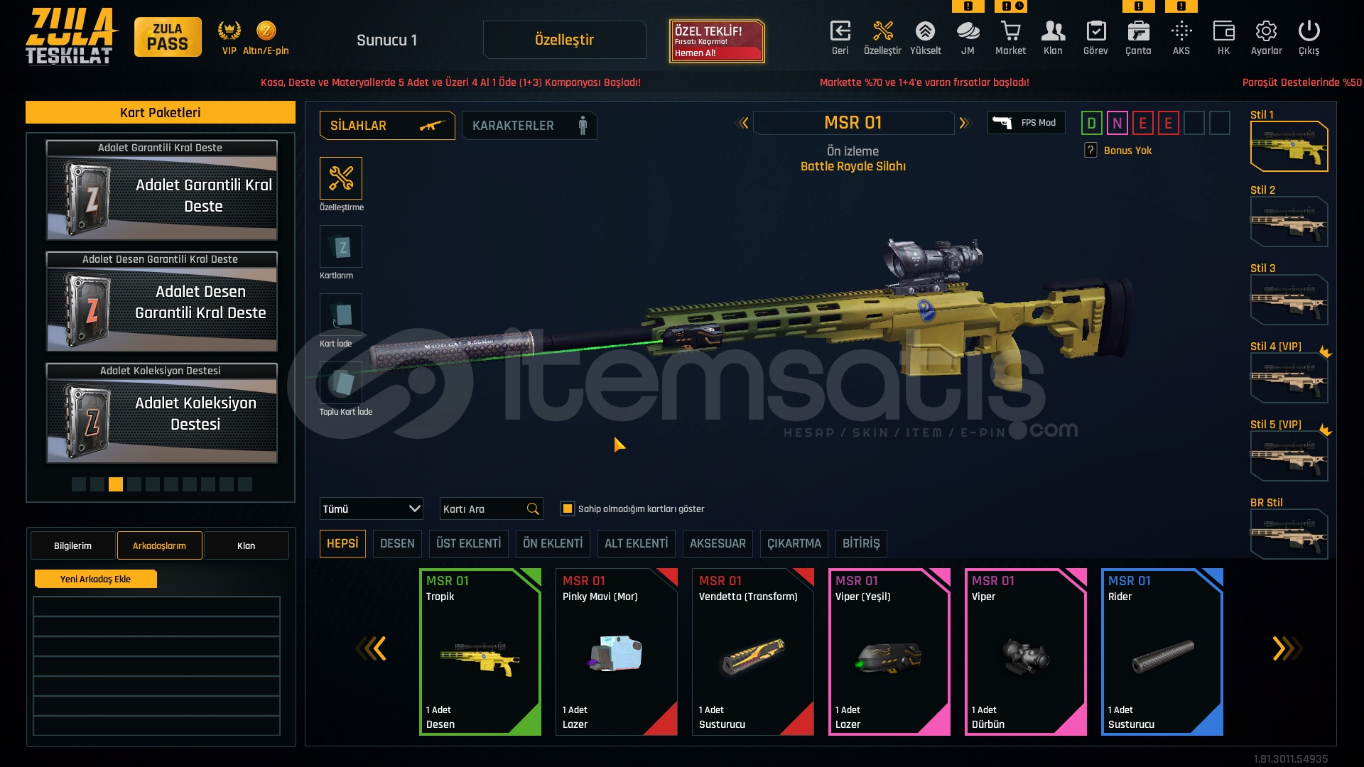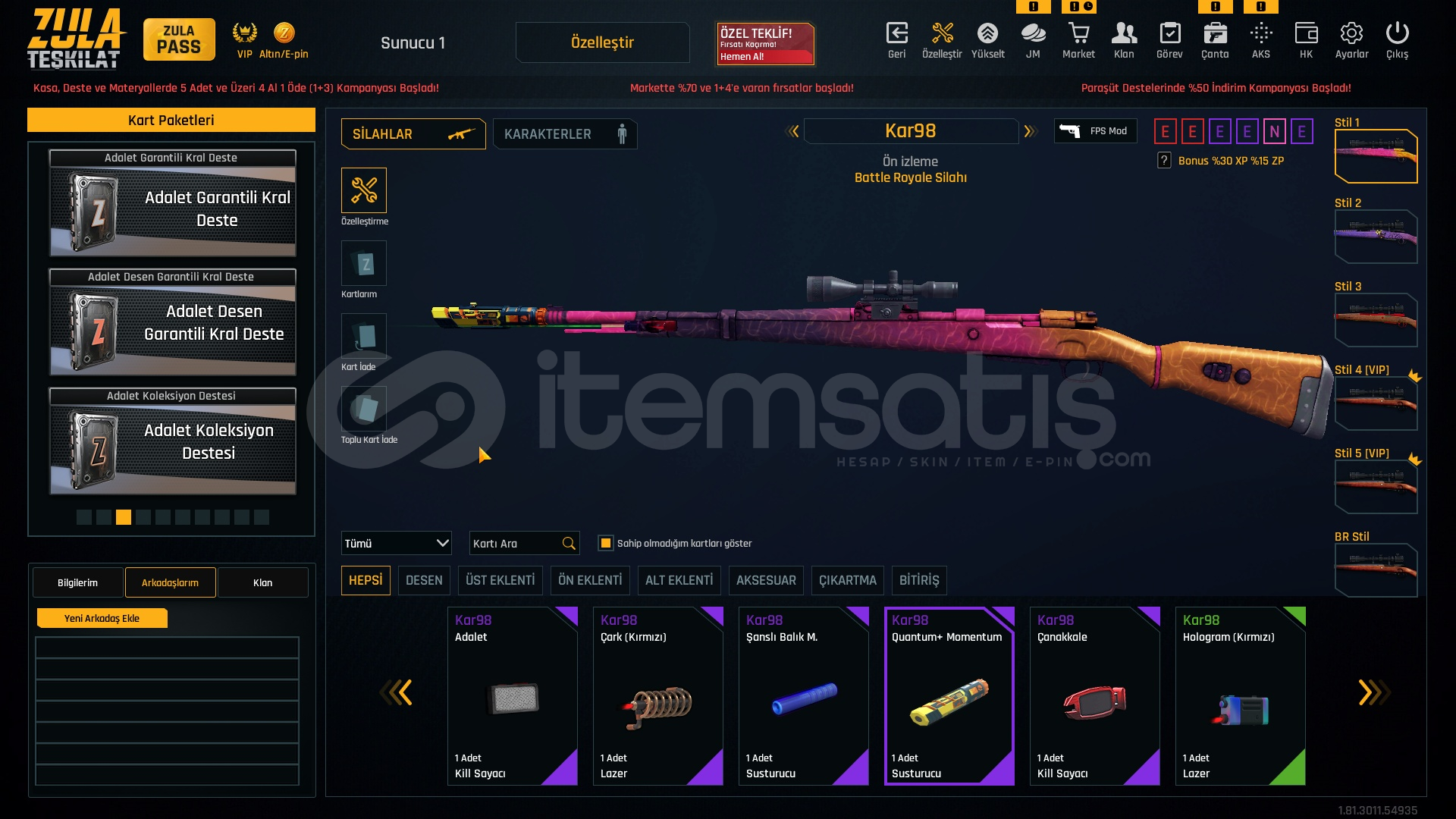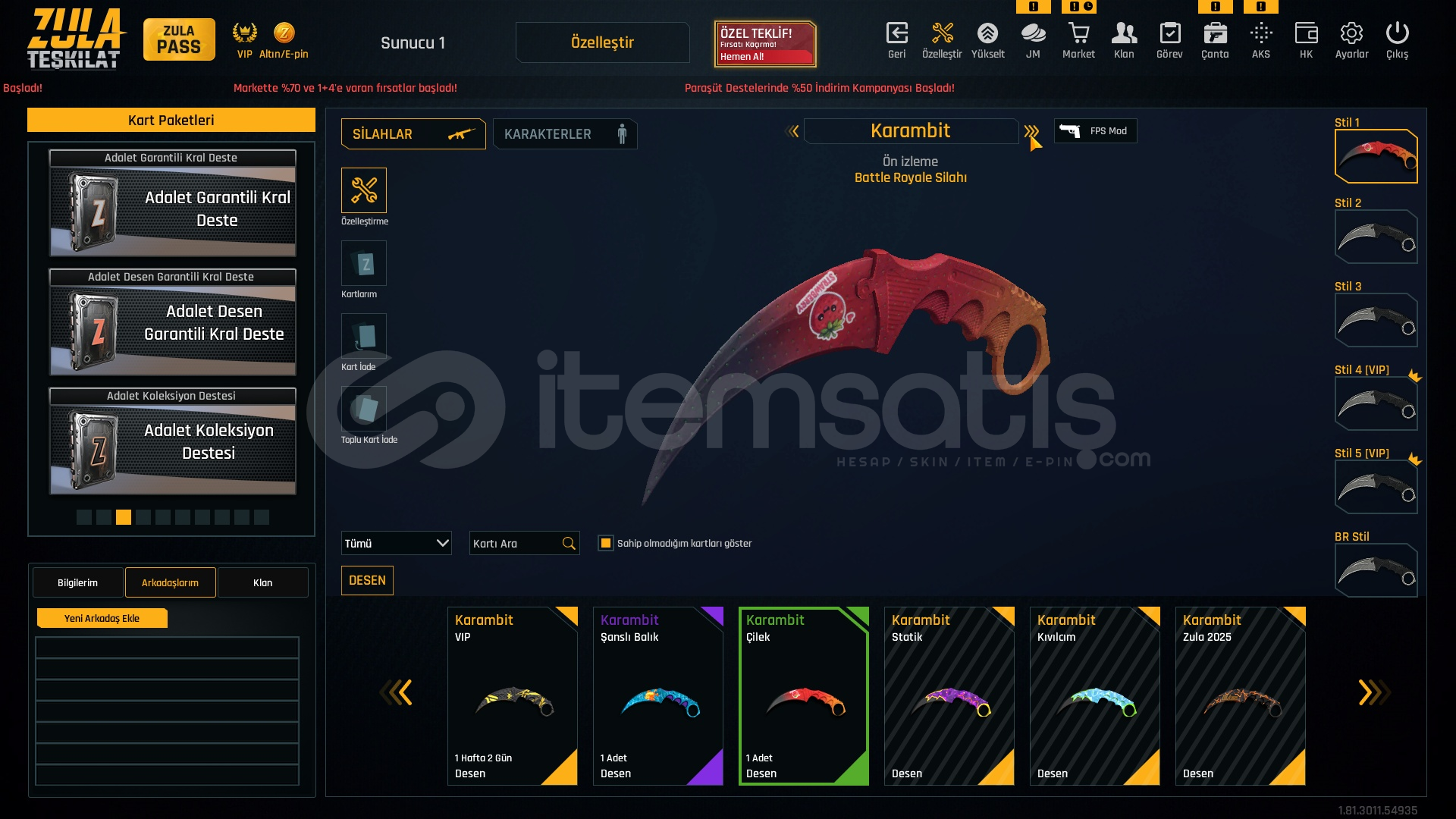 72 SeviyeZula Pass aktifdir 55 de2x İsim kartı1x İstatik sıfırlama kartıHesapta sadece karambit ve mk3 (+5)Sormak istediğiniz soru varsa dm den ulaşabilirsiniz.Fiyat konusuna gelecek olursa site komisyon aldığı için fiyat bir tık yüksek olabilirKeyifli alışverişler dilerim.