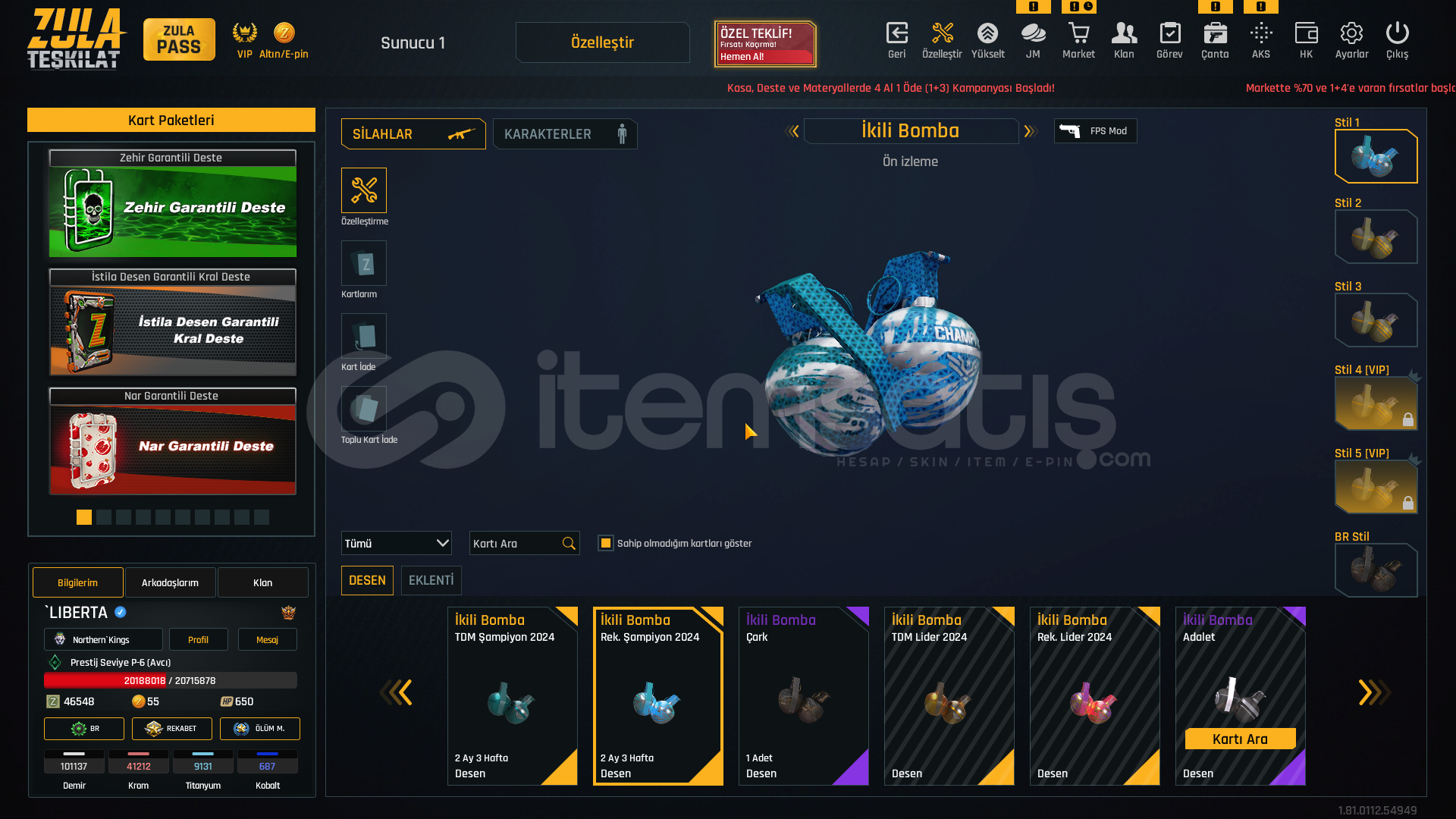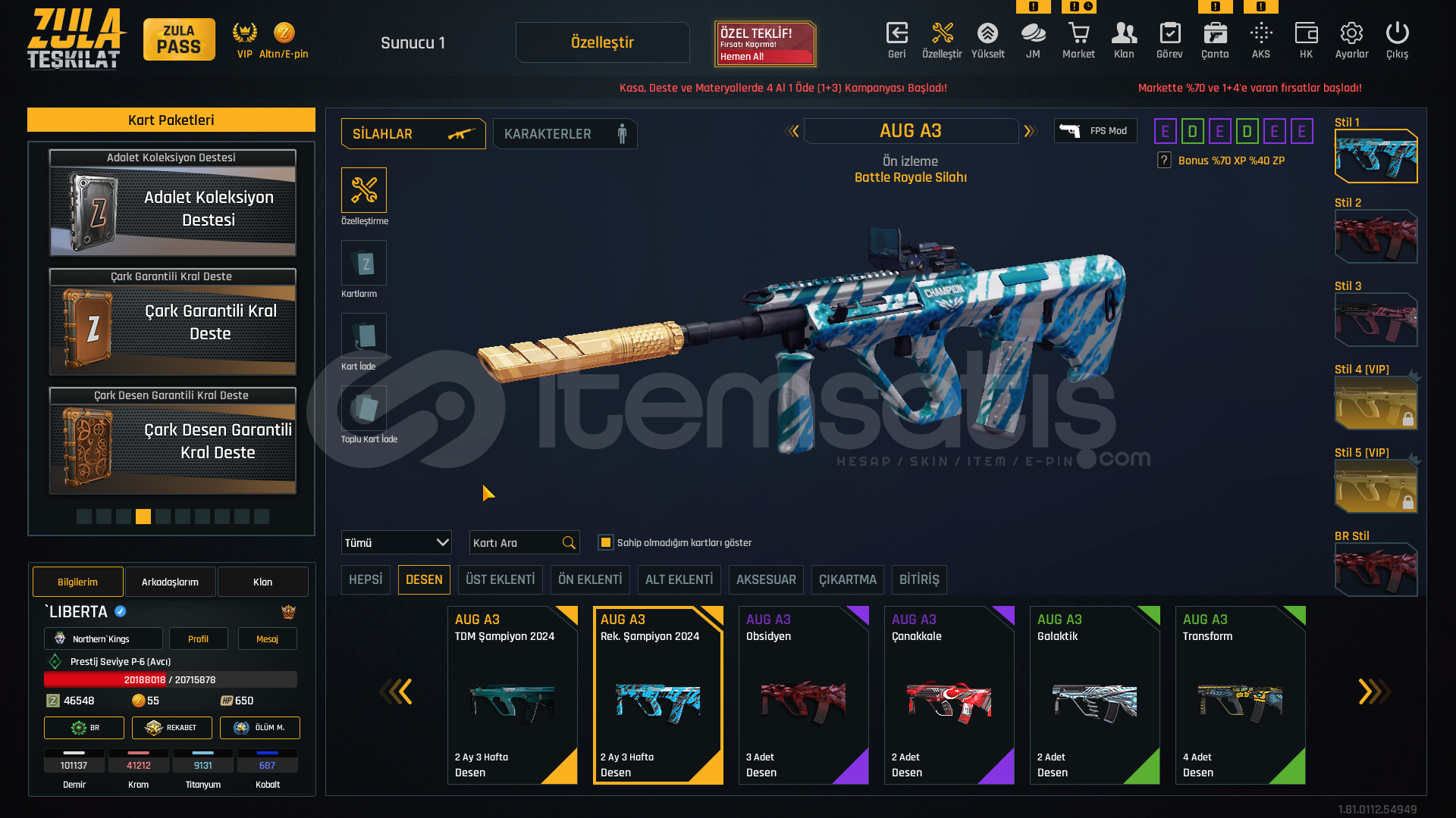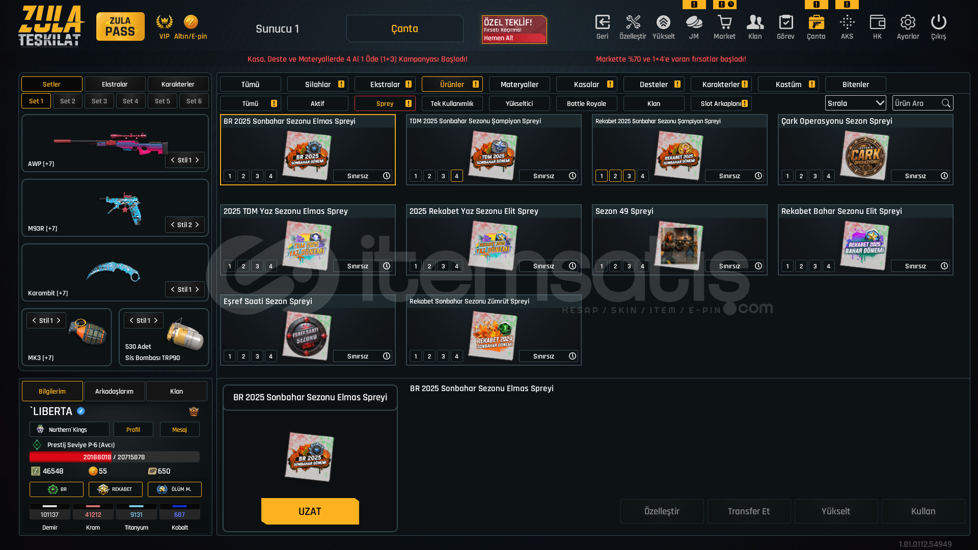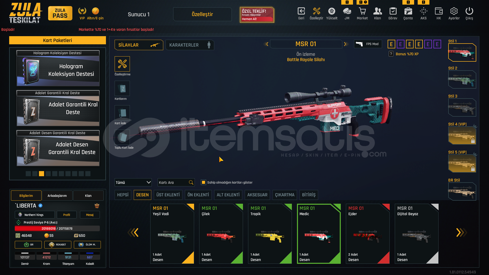 S-kelebek+7S-iki bomba+7storm+7rs-s1+7msr-01+7awp+7kar 98+7mpt 76+7m93r+7deagle+7cnk+6karambit+7ustura+7dehşet+7wildcat+6mk3+7ikili c5+7kiera Jelani 119 günZeynep Yılmaz 87 günBay Han 72 günLeyla Kurt 51 gün +5 sınırsız koşma %25 kask sınırsızElena Terentjeva 30 gün +5 sınırsız koşmakayıp azaltıcı %50 3 adetşans arttıcı %30 1 adetşans arttırıcı %50 1 adetkay...