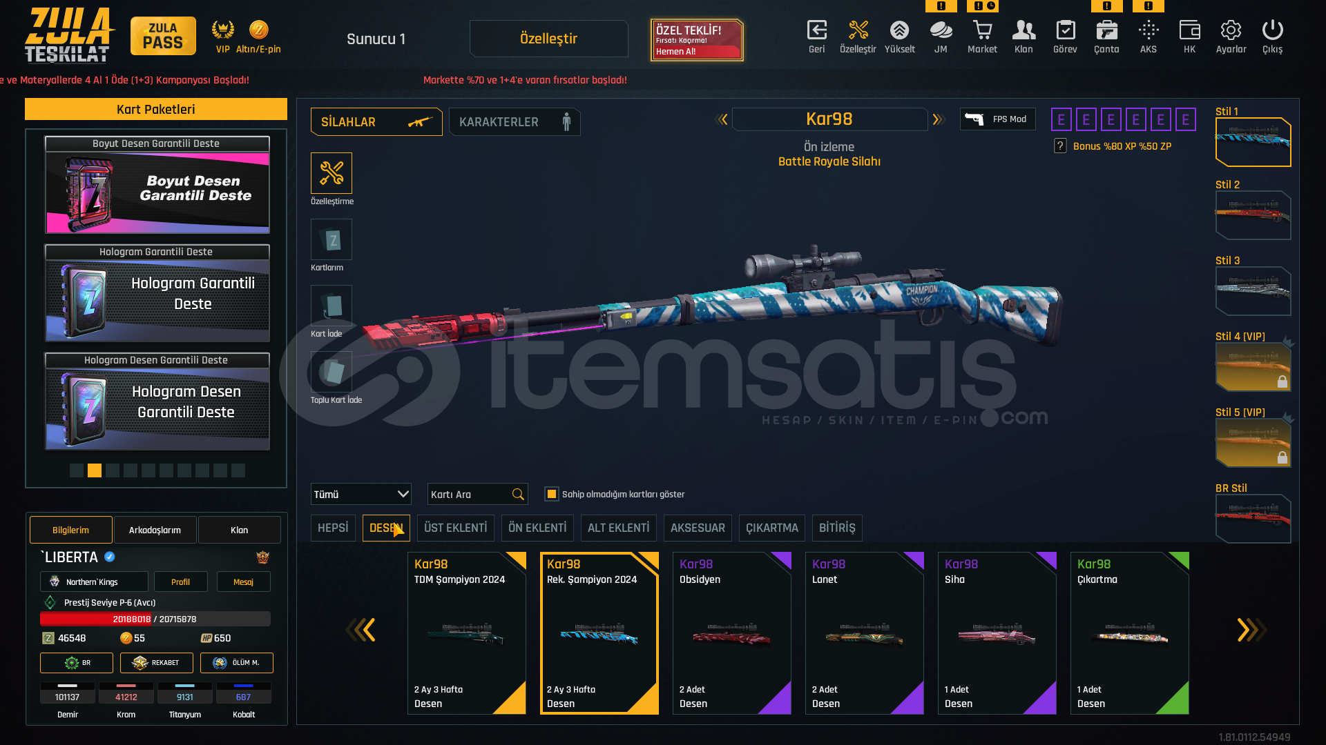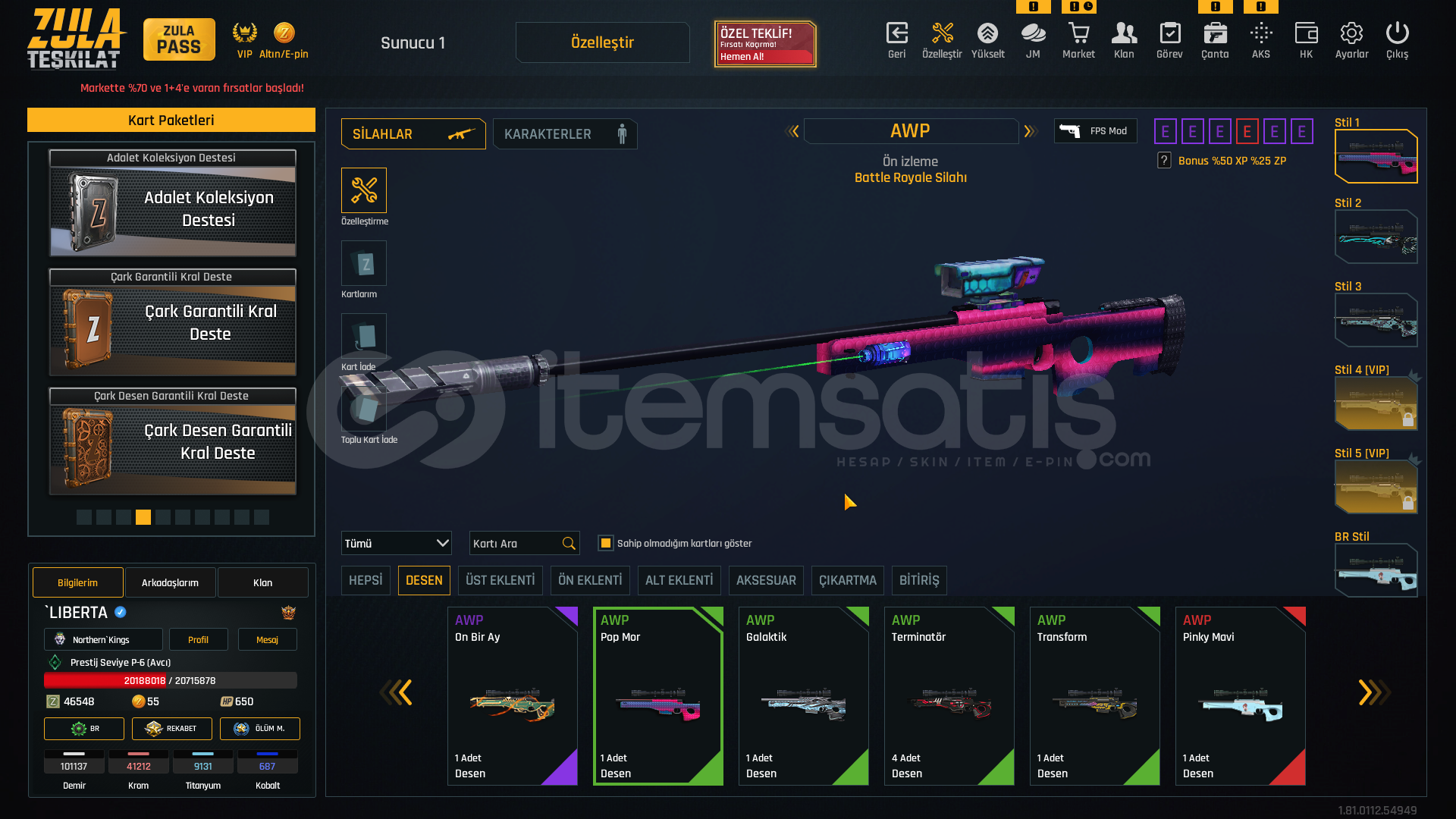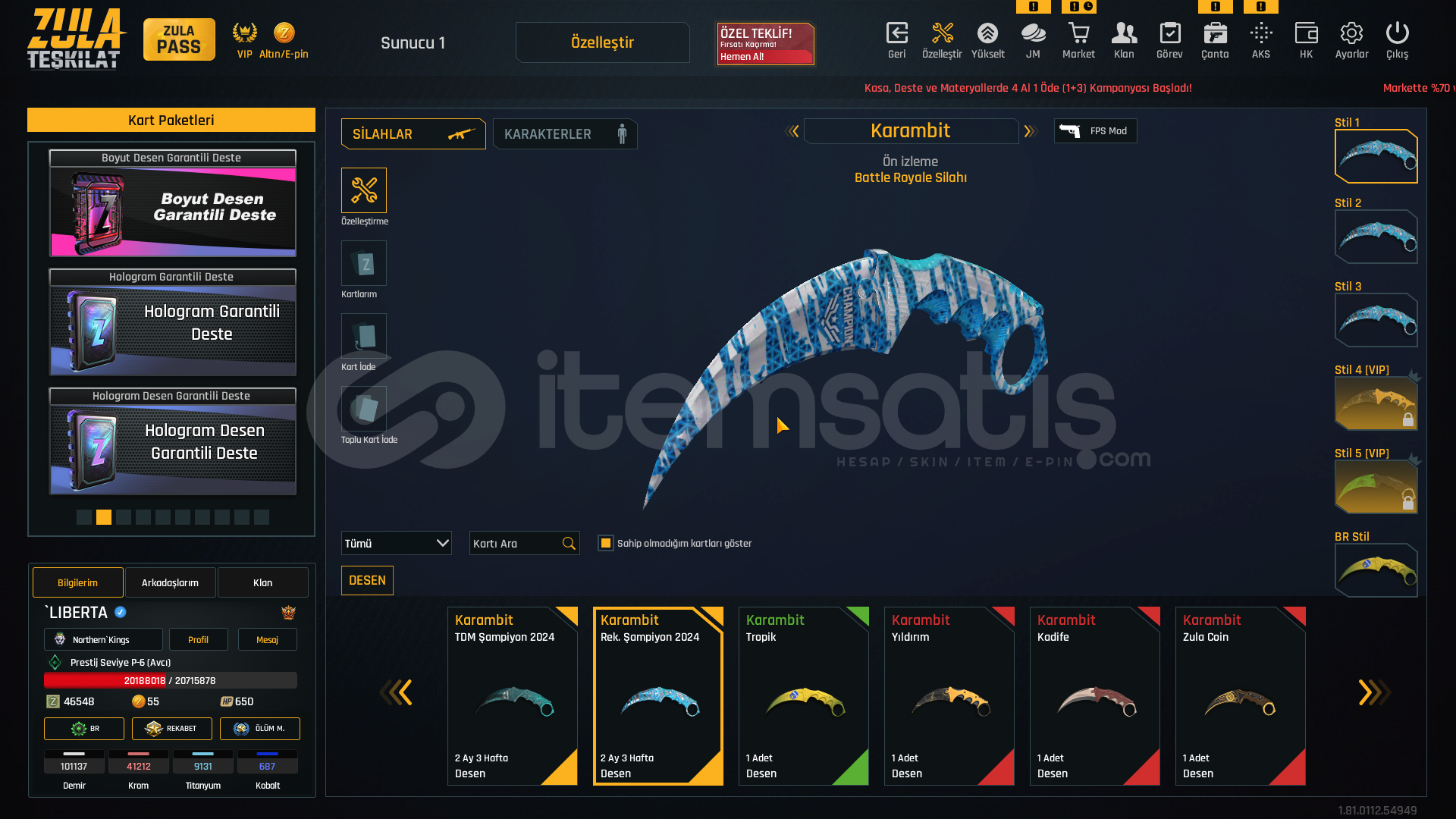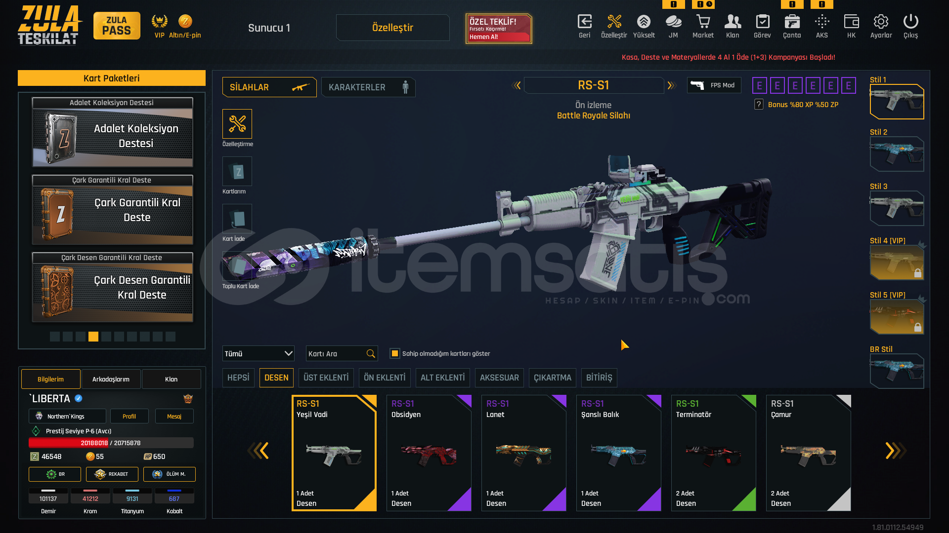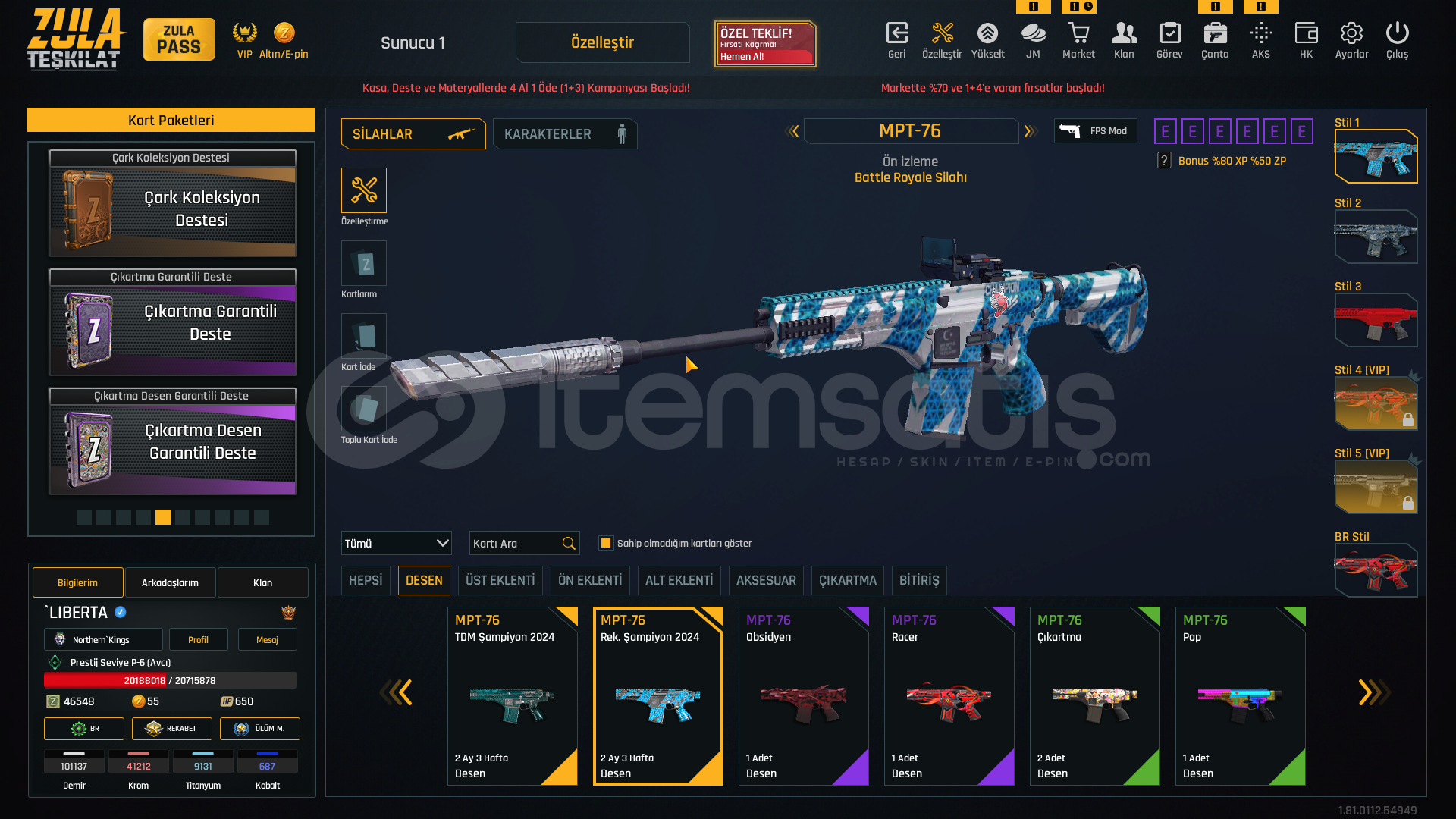S-kelebek+7S-iki bomba+7storm+7rs-s1+7msr-01+7awp+7kar 98+7mpt 76+7m93r+7deagle+7cnk+6karambit+7ustura+7dehşet+7wildcat+6mk3+7ikili c5+7kiera Jelani 119 günZeynep Yılmaz 87 günBay Han 72 günLeyla Kurt 51 gün +5 sınırsız koşma %25 kask sınırsızElena Terentjeva 30 gün +5 sınırsız koşmakayıp azaltıcı %50 3 adetşans arttıcı %30 1 adetşans arttırıcı %50 1 adetkay...