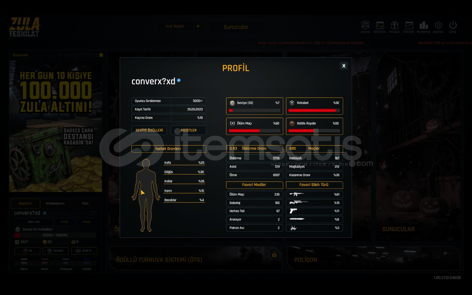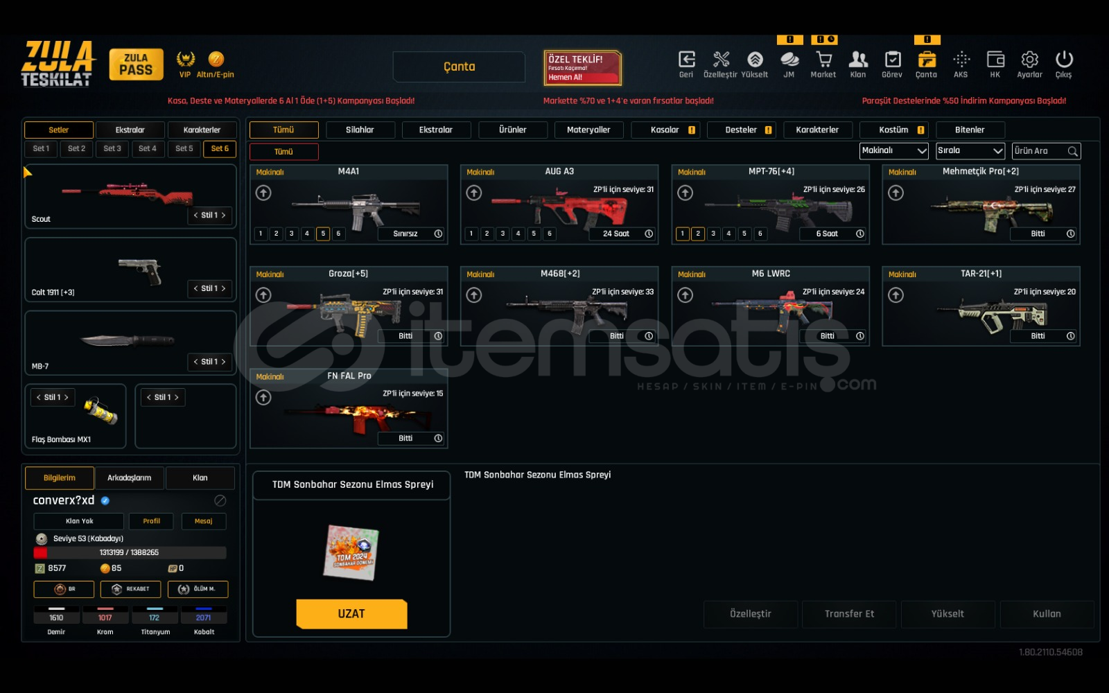 satılık 53 levelli zula hesabımız vardır hesapta özleştirmeli +lı silahlar vardır 4 adet istim değitirme 1 adet istatik sıfırlama vardır