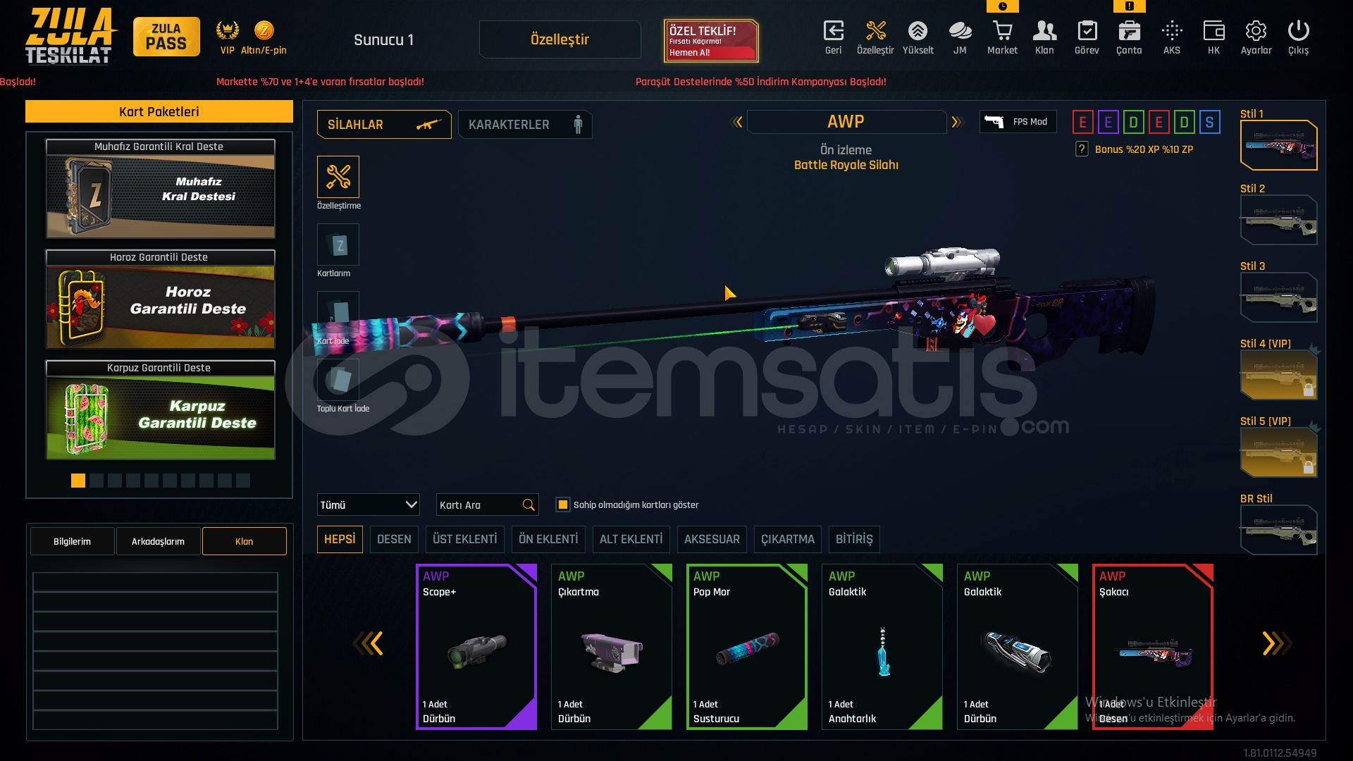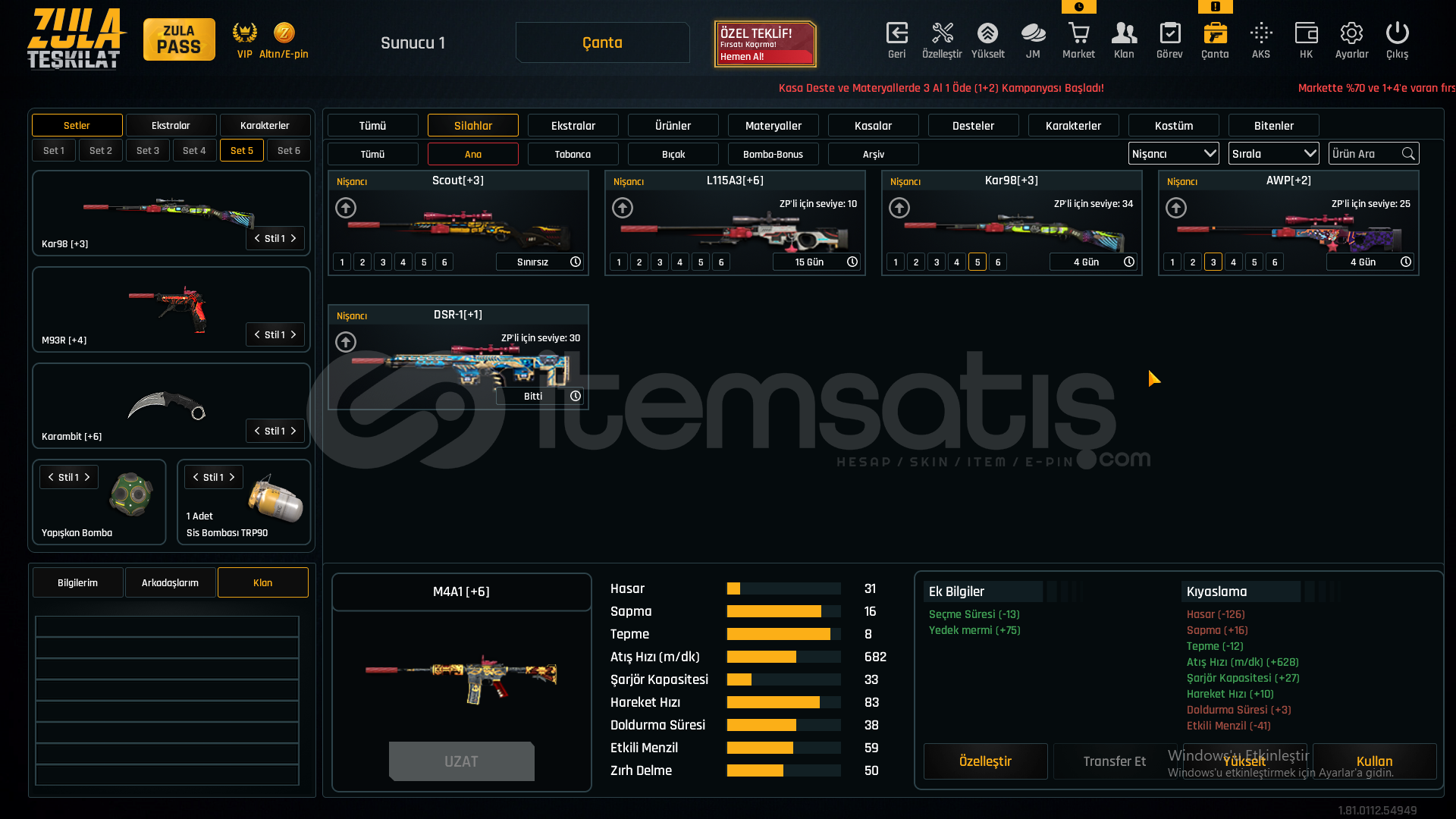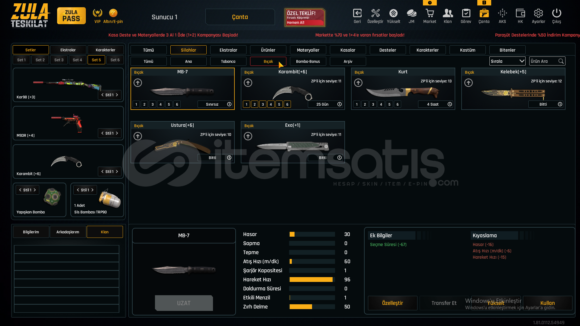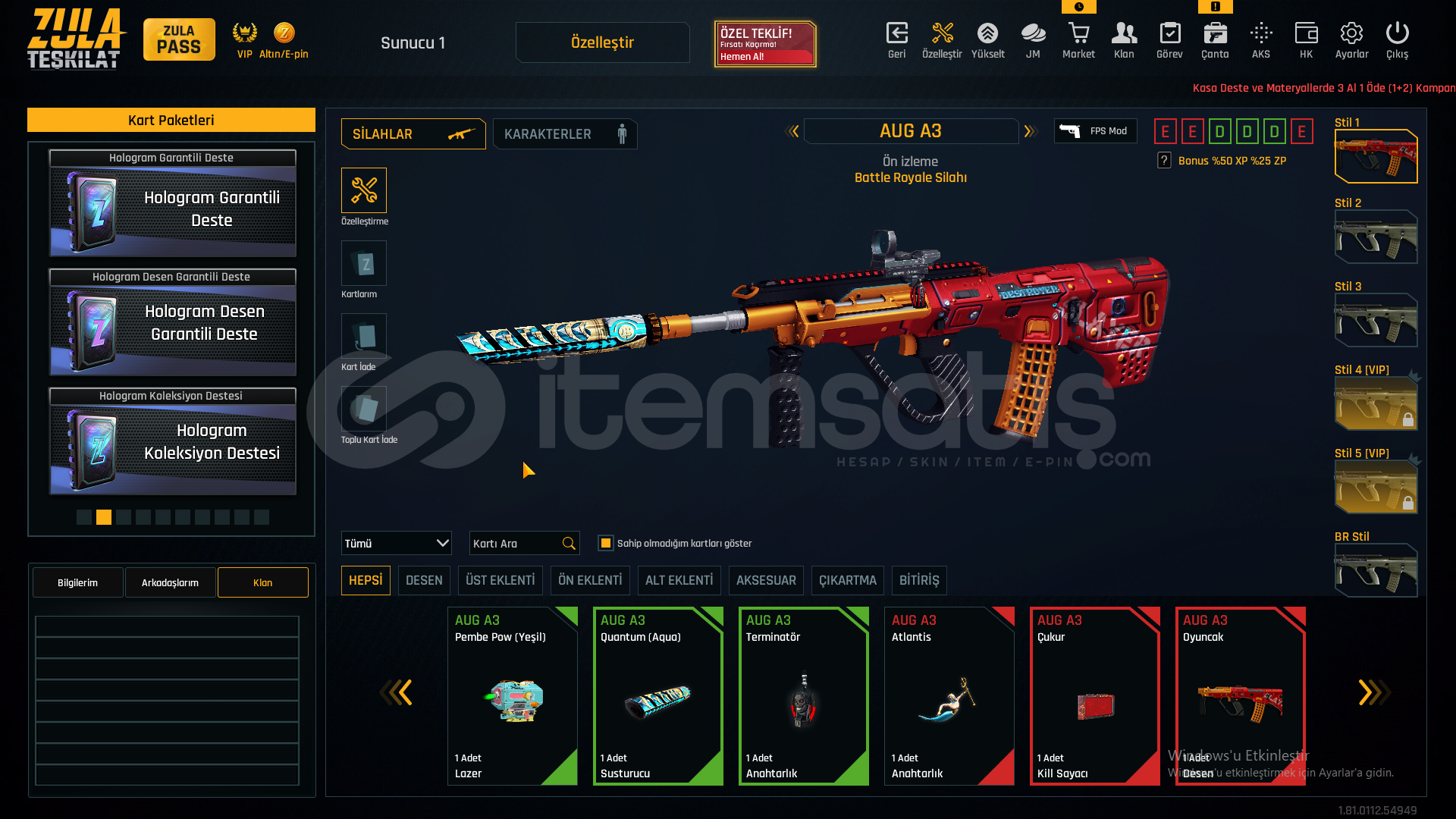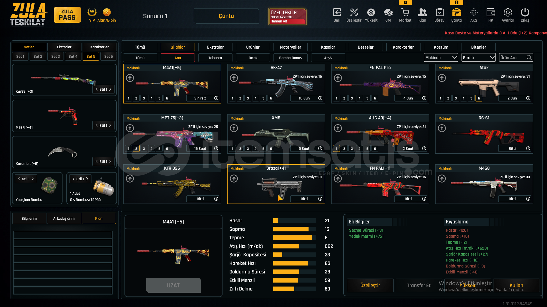 55 SEVİYEAUG A3[+4]MPT-76[+3]GROZA[+4]L11EA3[+6]KAR-98[+3]AWP[+2]M93R[+4]KARAMBİT[+6]USTURA[+6]KELEBEK[+5]İKİLİ BOMBA[+1]DESERT EAGLE[+3]M4A1[+6]SCOUT[+3]ÖZELLEŞTİRMELERAWP SCOPE+KAR98 ÇARK DESENGLOCK 18 QUANTUMAUG A3 QUANTUM40K ZULA PARASIMETARYELLERDEMİR-7827KROM-6320TİTANYUM-2396KROM-2867