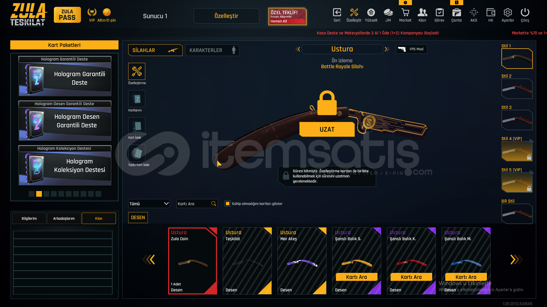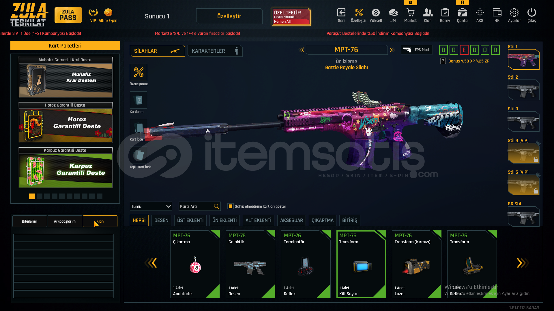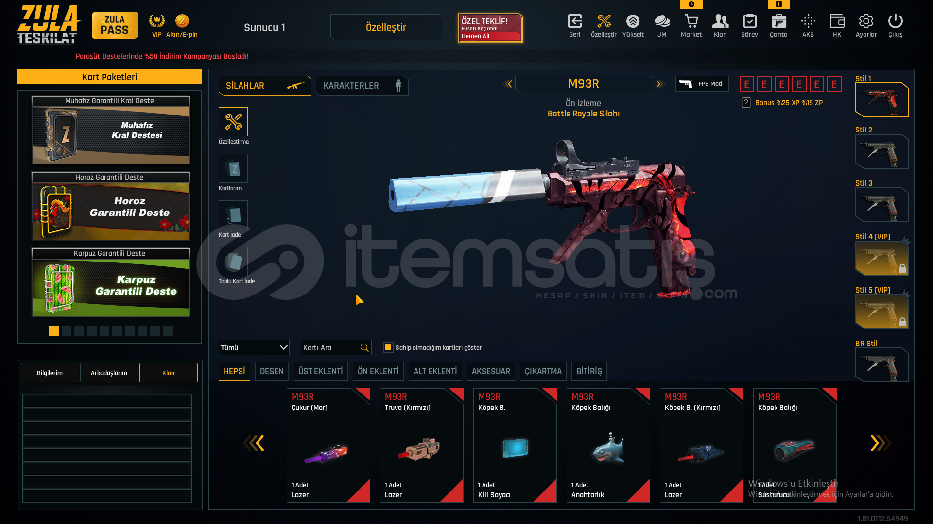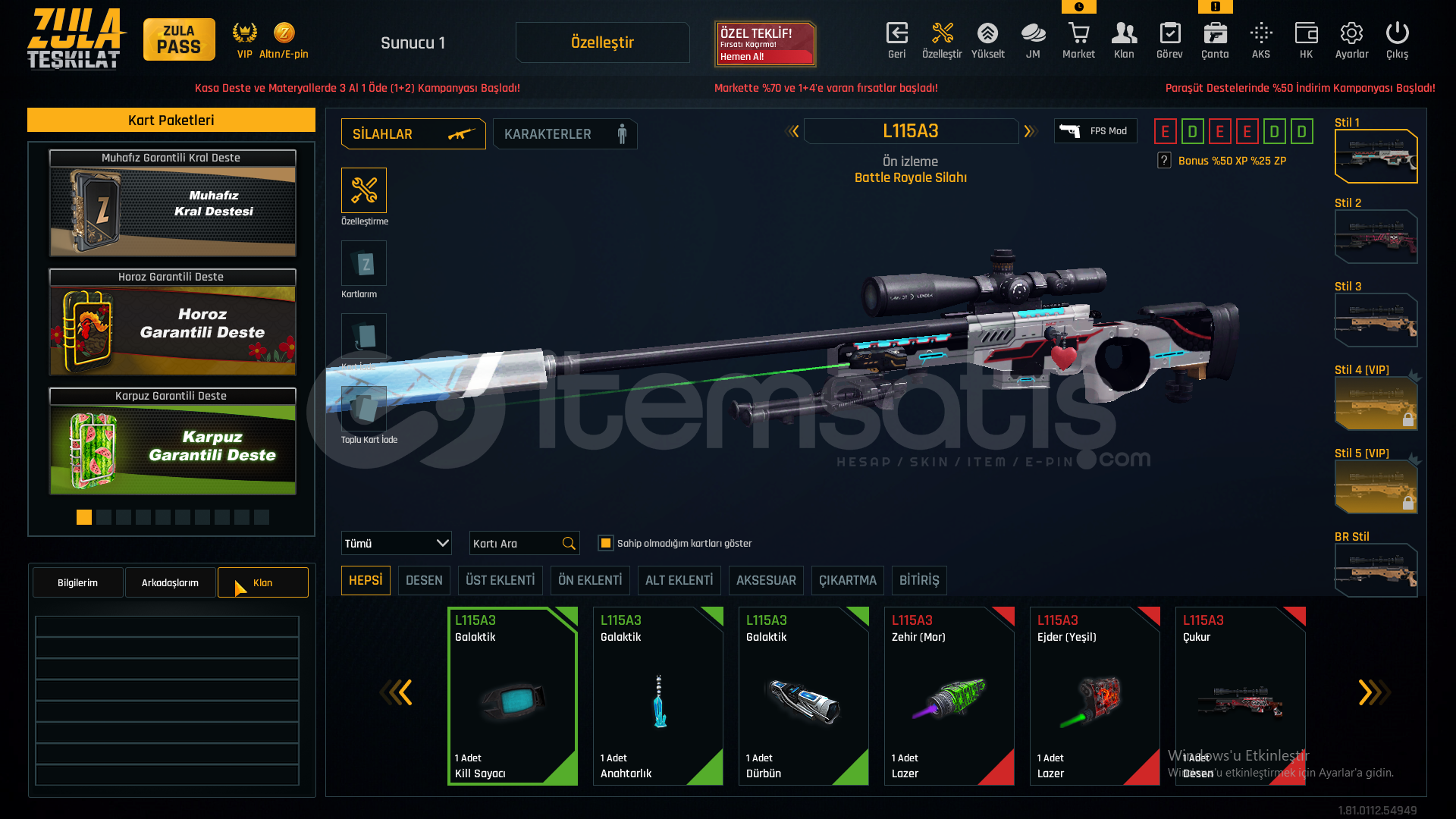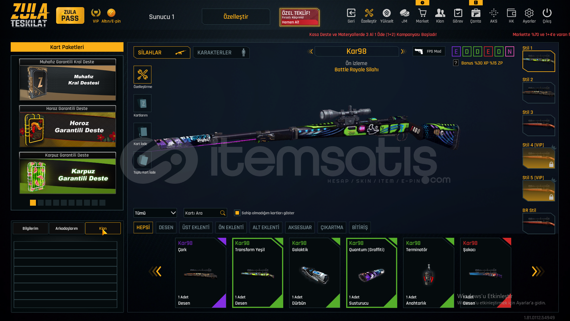 55 SEVİYEAUG A3[+4]MPT-76[+3]GROZA[+4]L11EA3[+6]KAR-98[+3]AWP[+2]M93R[+4]KARAMBİT[+6]USTURA[+6]KELEBEK[+5]İKİLİ BOMBA[+1]DESERT EAGLE[+3]M4A1[+6]SCOUT[+3]ÖZELLEŞTİRMELERAWP SCOPE+KAR98 ÇARK DESENGLOCK 18 QUANTUMAUG A3 QUANTUM40K ZULA PARASIMETARYELLERDEMİR-7827KROM-6320TİTANYUM-2396KROM-2867