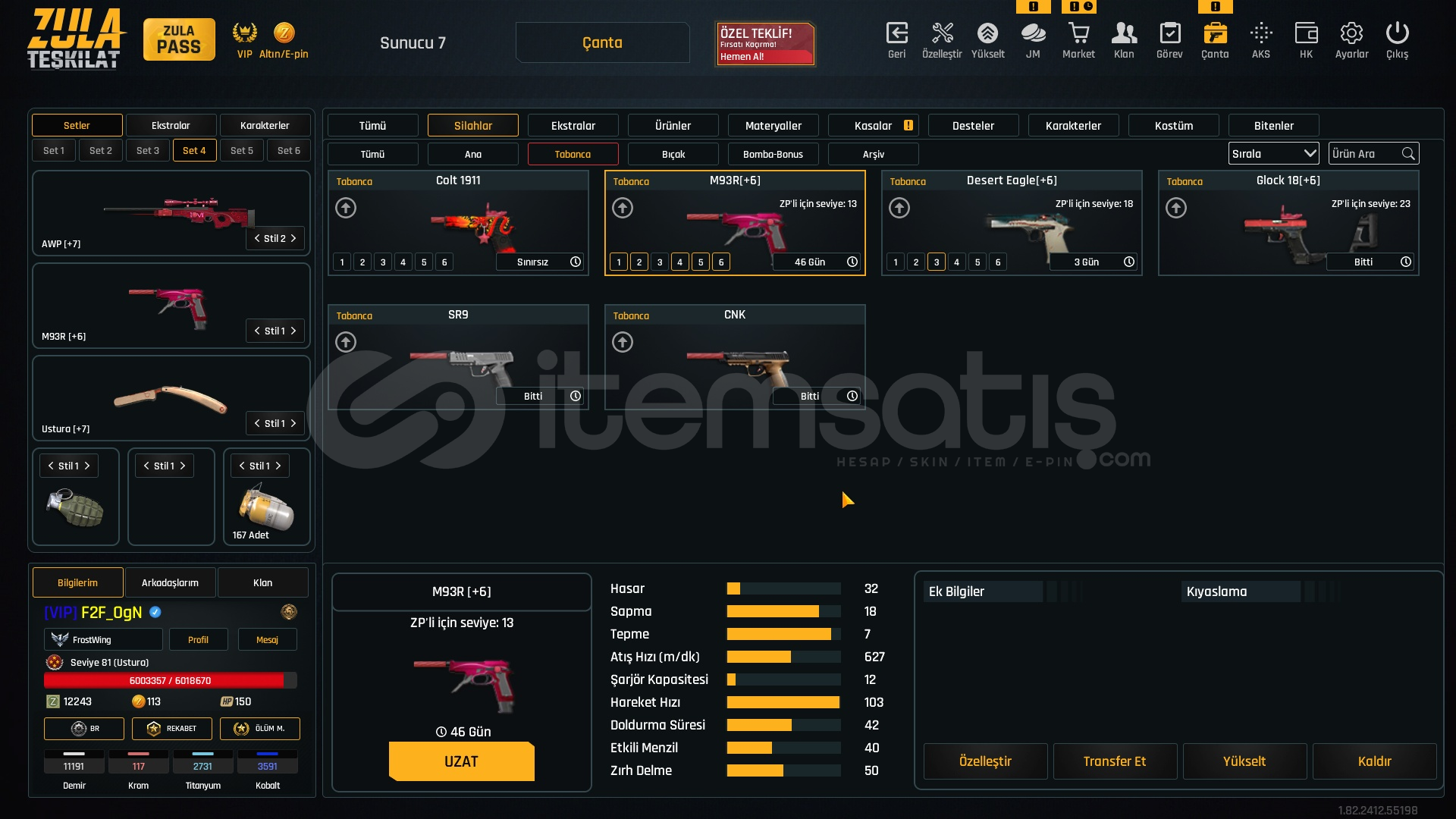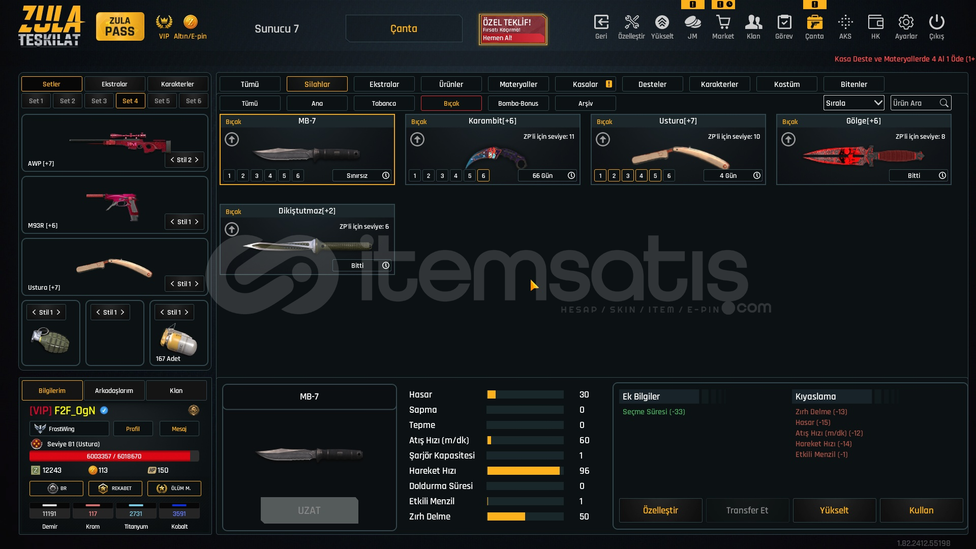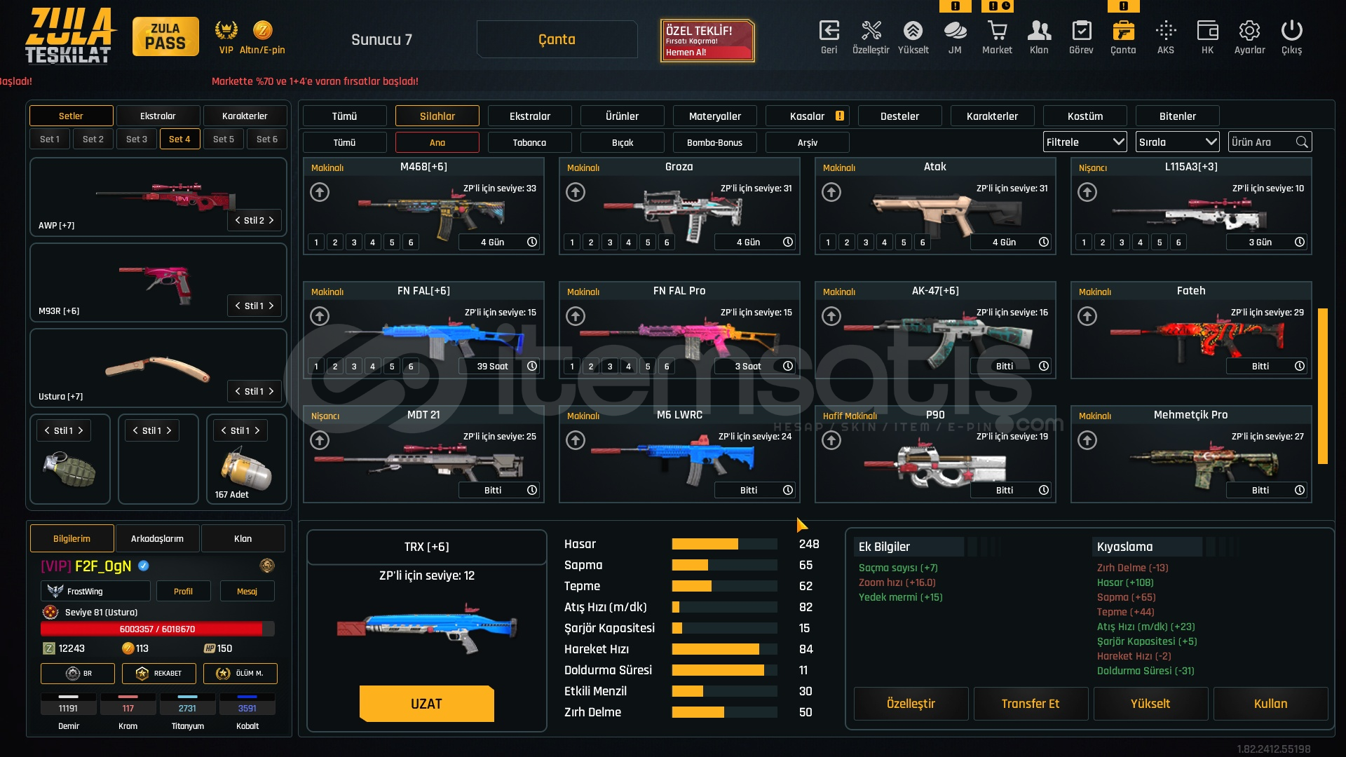 HESABIMI SATIYORUM !!KURULUŞ TARİHİ 24.01.2016HERHANGİ BİR SUSTURMA BAN VS YOKTUR HESAP ARTI BAKIMINDAN İYİ DURUMDADIR MAİL VE TELEFON SAĞLAMDADIR DEĞİŞİMİ YAPILACAKTIR --ARTILAR---MSR 01 +7 AWP +7 (Quantum vardır)USTURA +7MPT76 +6 (Quantum vardır , Quantum+ vardır )M468 +6 (Quantum vardır)KARAMBİT +6TRX +6 (SINIRSIZ)M93R +6 (Quantum vardır)MK3 +6DESERT EAGLE +6FN FAL +6 AK47 +6 (Quantum vard...