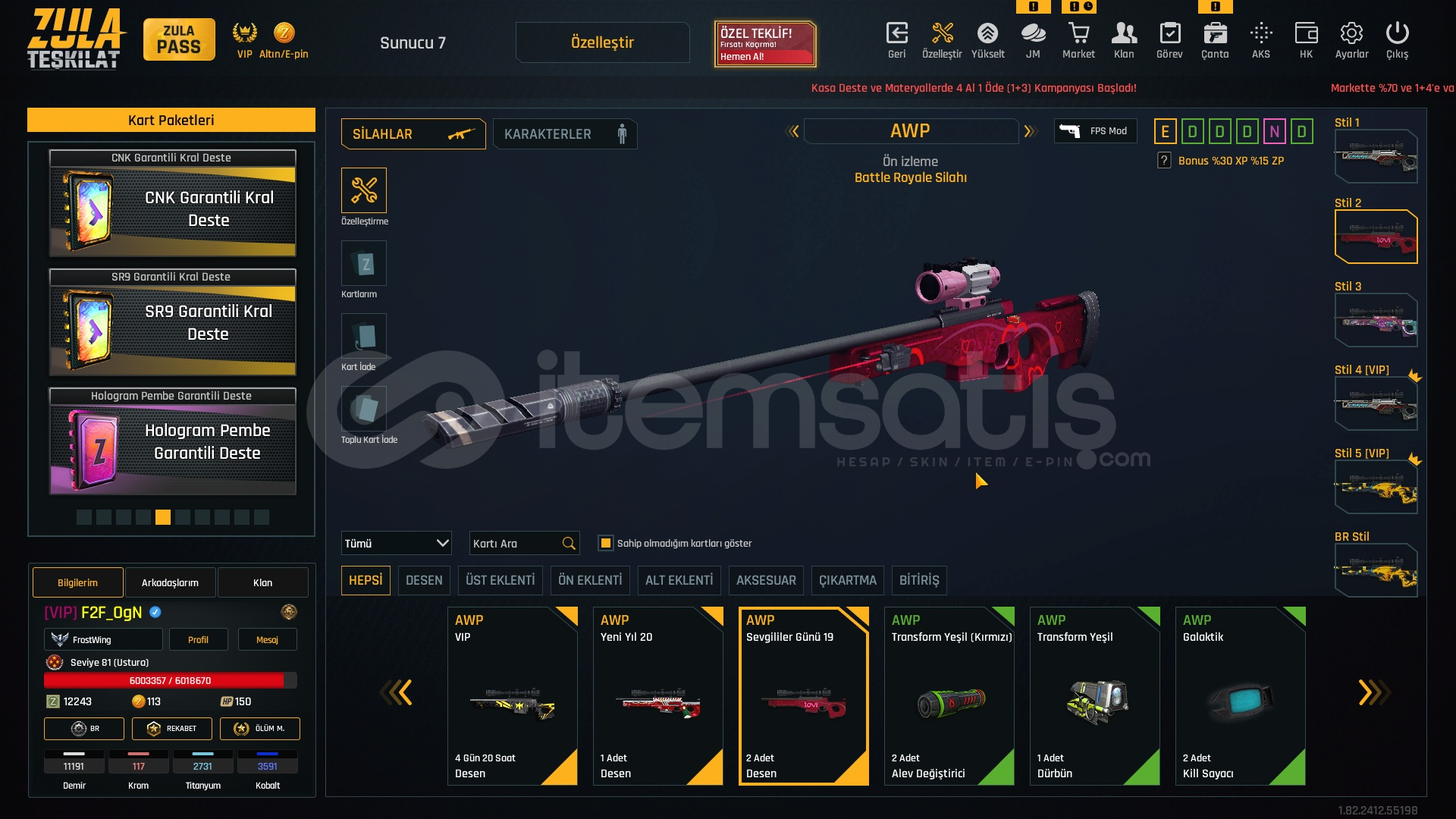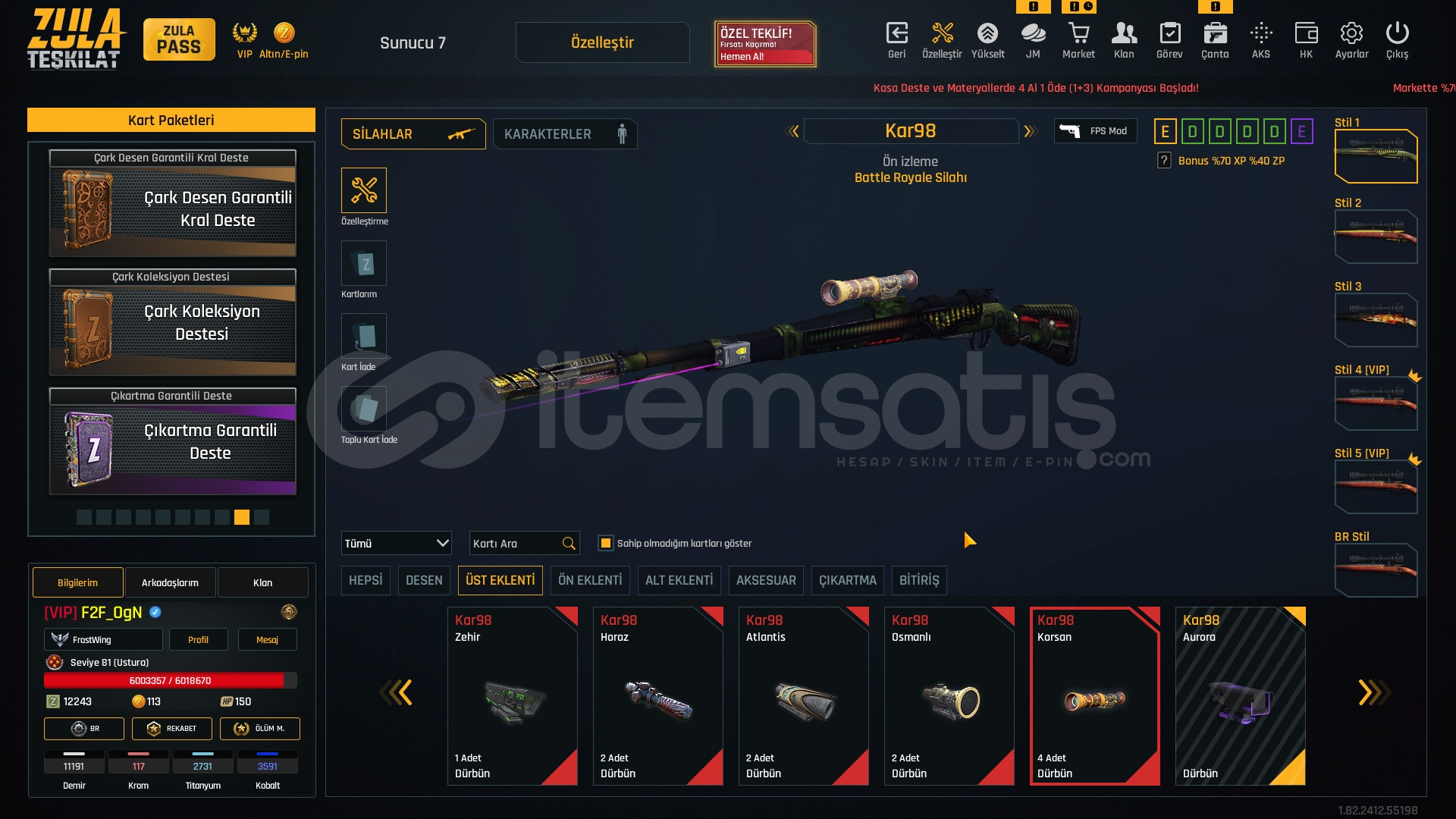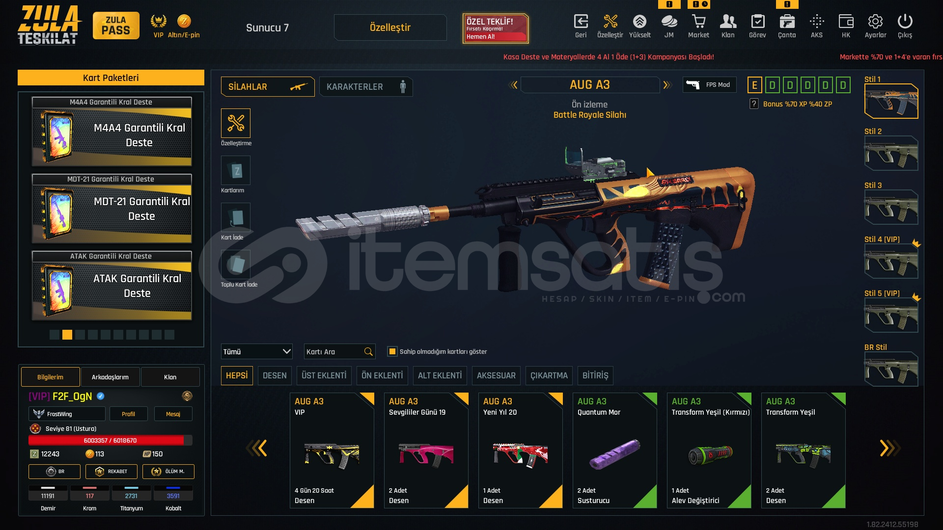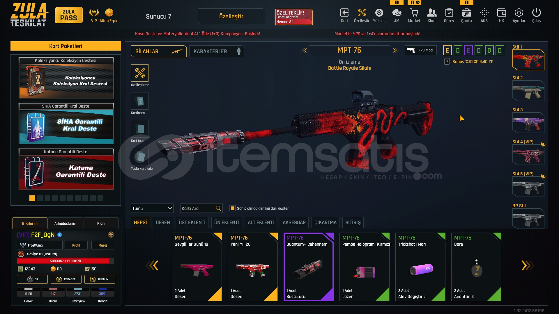 HESABIMI SATIYORUM !!KURULUŞ TARİHİ 24.01.2016HERHANGİ BİR SUSTURMA BAN VS YOKTUR HESAP ARTI BAKIMINDAN İYİ DURUMDADIR MAİL VE TELEFON SAĞLAMDADIR DEĞİŞİMİ YAPILACAKTIR --ARTILAR---MSR 01 +7 AWP +7 (Quantum vardır)USTURA +7MPT76 +6 (Quantum vardır , Quantum+ vardır )M468 +6 (Quantum vardır)KARAMBİT +6TRX +6 (SINIRSIZ)M93R +6 (Quantum vardır)MK3 +6DESERT EAGLE +6FN FAL +6 AK47 +6 (Quantum vard...