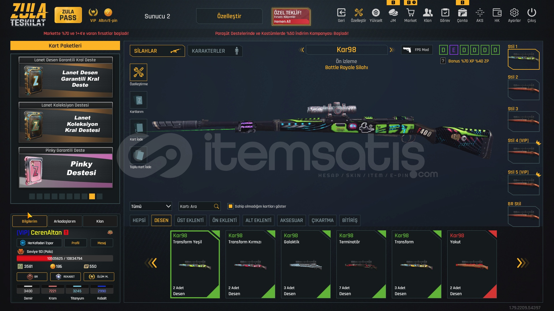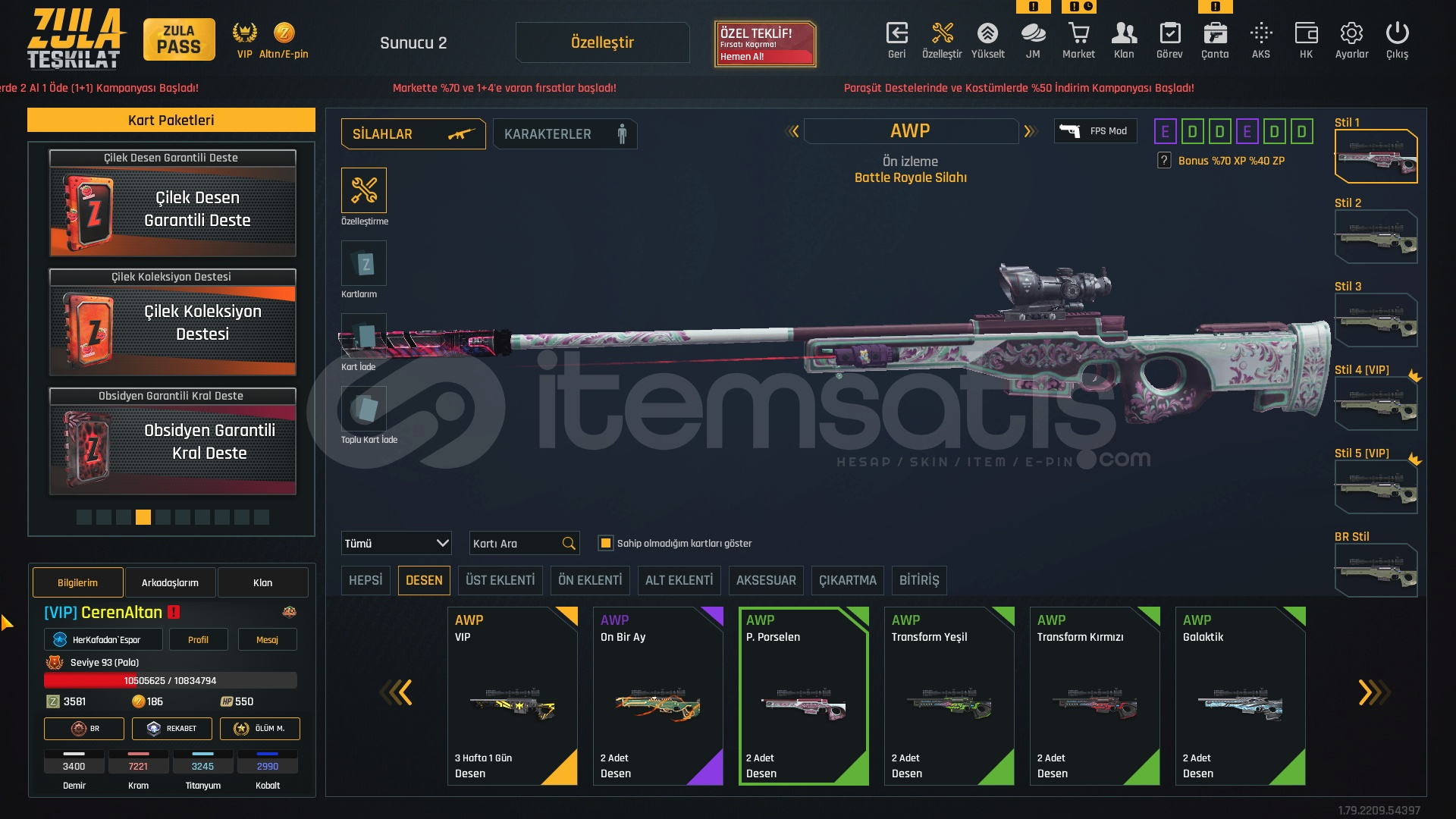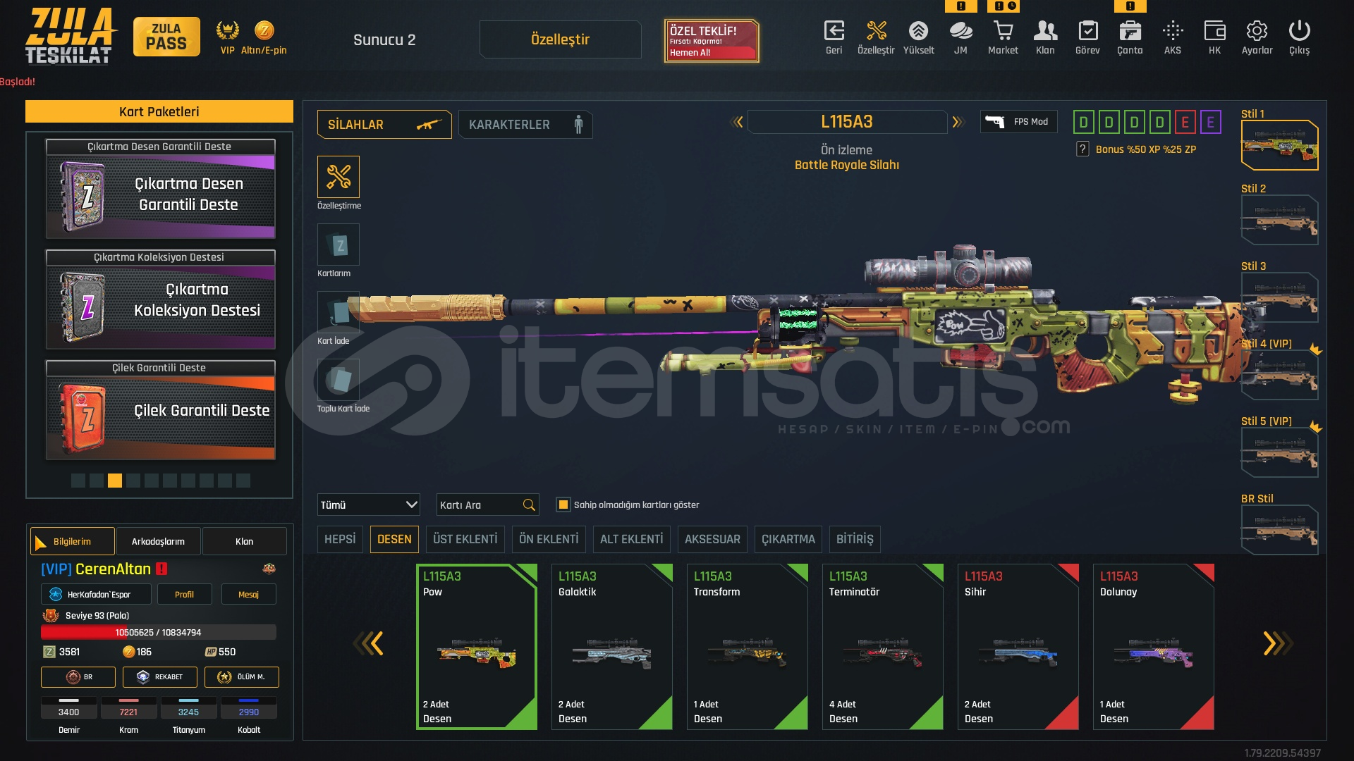 SEVİYE 93 BÜTÇE DOSTU HESAP☀️2150₺☀️🍃ZULA PASS AÇIKTIR 93 SEVİYE🍃🍃1 ADET TAKMA İSİM DEĞİŞTİRİCİ🍃🍃3 HAFTALIK VİP MEVCUT🍃🍃M468 ÇIKARTMA DESEN🍃[SINIRSIZ] +6 M93R[SINIRSIZ] +6 KARAMBİT[SINIRSIZ] +6 DESERT EAGLE[SINIRSIZ] +6 BORA12[SINIRSIZ] +6 P90[SINIRSIZ] +6 MEHMETCİK[SINIRSIZ] +6 XCRL[SINIRSIZ] EL PATRON[SINIRSIZ...