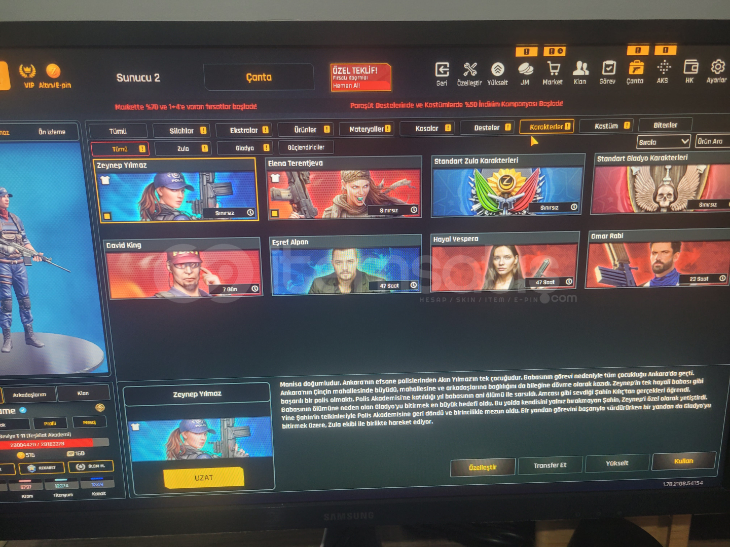 Seviye: Teşkilat T 11 sıralama 3500lerdeSusturma ban hiç yemedi. Emek hesabı el emeği göz nuru hesapNick bile hiç değişmedi :)Mail tel sağlam. Hiç susturma yemedi.20 adet isim değiştirme*9 adet set görüntüleyici*3 adet istatik sıfırlama*1 adet Klan kapasitesi +5 Birçok desen eldiven sprey ve ıvır zıvırlar mevcutYıllarca para(za) harcamadan oyun parası(zp) ile oyna...