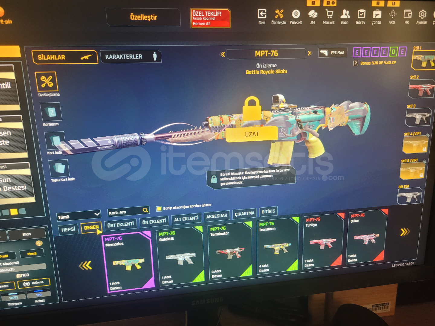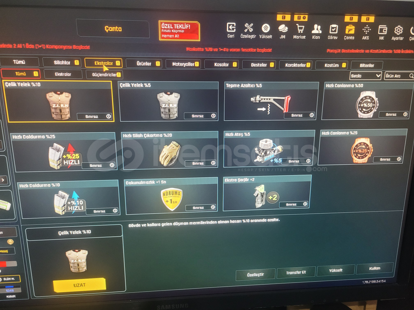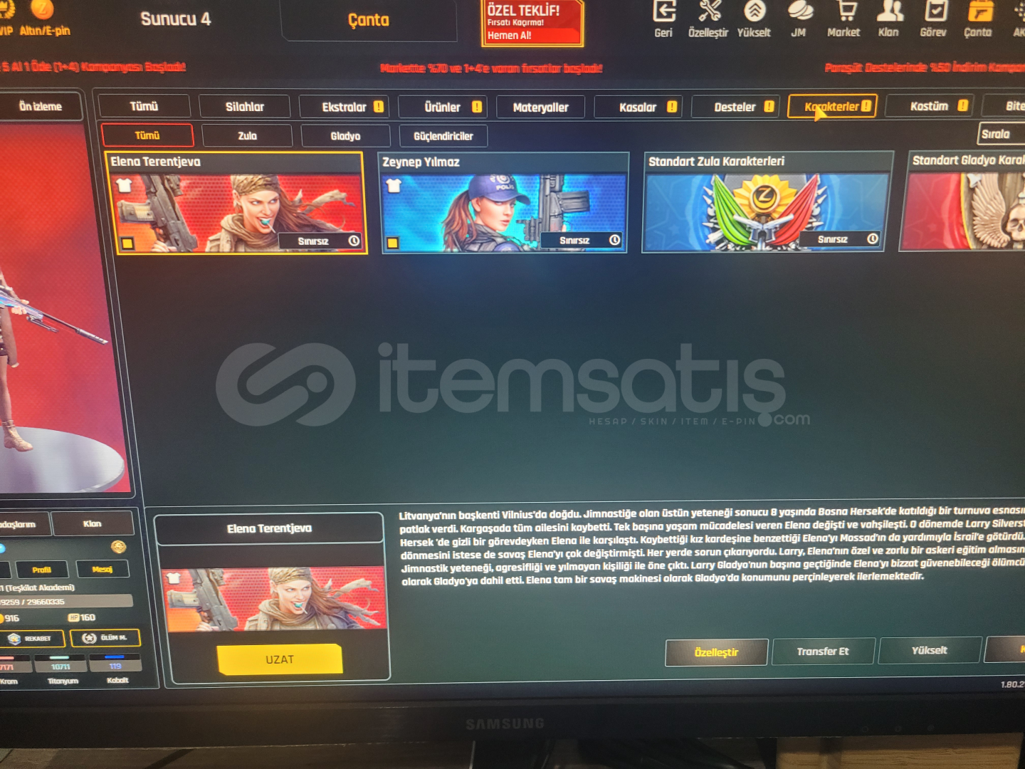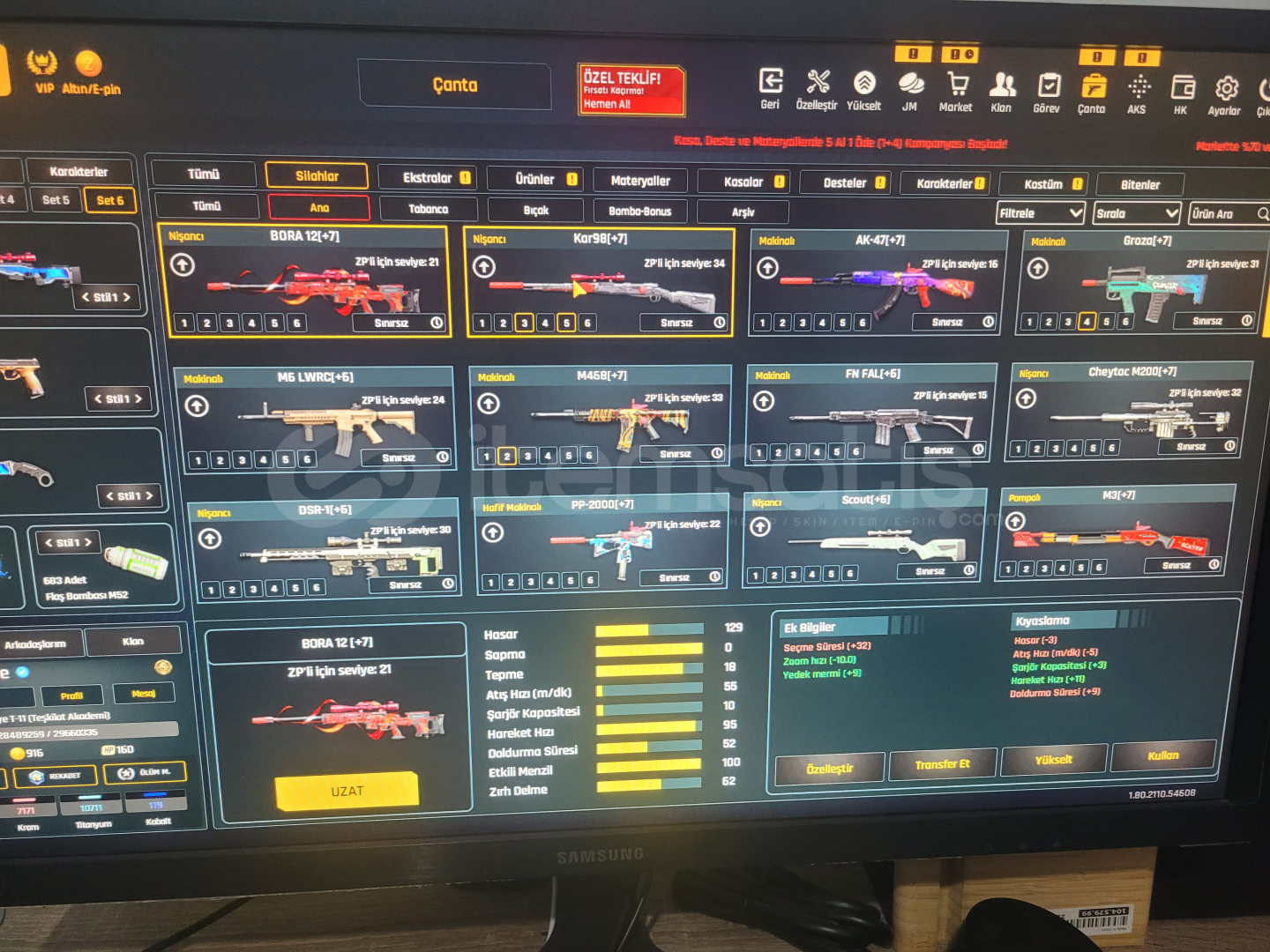 Seviye: Teşkilat T 11sıralama 3500lerdeEmek hesabı arasan bulamazsınNick bile hiç değişmedi :)*20 adet isim değiştirme*9 adet set görüntüleyici*3 adet istatik sıfırlama*1 adet Klan kapasitesi +5Birçok Desen Quantum Eklentiler Sınırsız eldiven vs ıvır zıvırlar mevcutYıllarca para(za) harcamadan oyun parası(zp) ile oynayabilirsiniz.[Extralar Hepsi SINIRSIZ!!]33 sını...