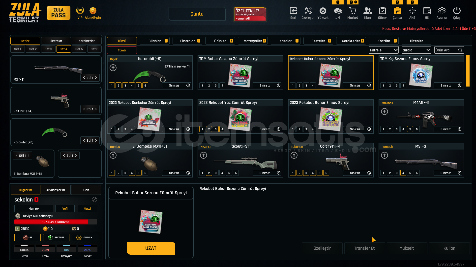 SINIRSIZ KARAMBİT BULUNUYOR!!!!-Hesap 53 leveldir.-RS-S1 quantum plus vardır.-Özelleştirmesi iyi durumdadır.------------------------------------------------SİLAHLAR;KELEBEK [+7]AK 47 [+7]KARAMBİT [+6]GLOCK 18 [+6]L115A3 [+6]DEAGLE [+6]GROZA [+5]MPT 76 [+5]M93R [+5]KAR98 [+3]RS-S1 [+2]---------------------------------------------Hesap başlangıç için en iyisinin iyisi fiyat performans.TEL MAİL DEĞİŞİYOR.