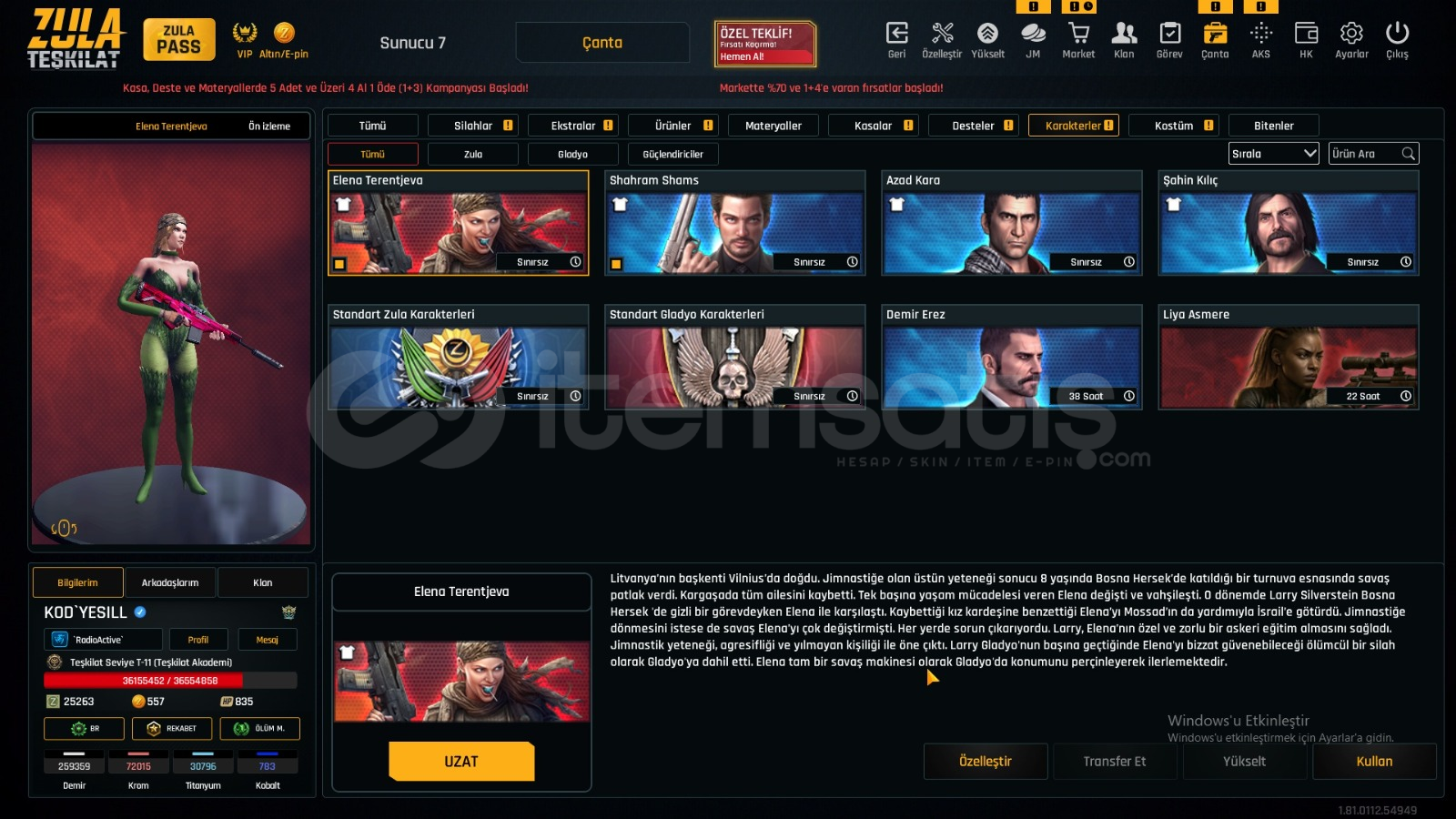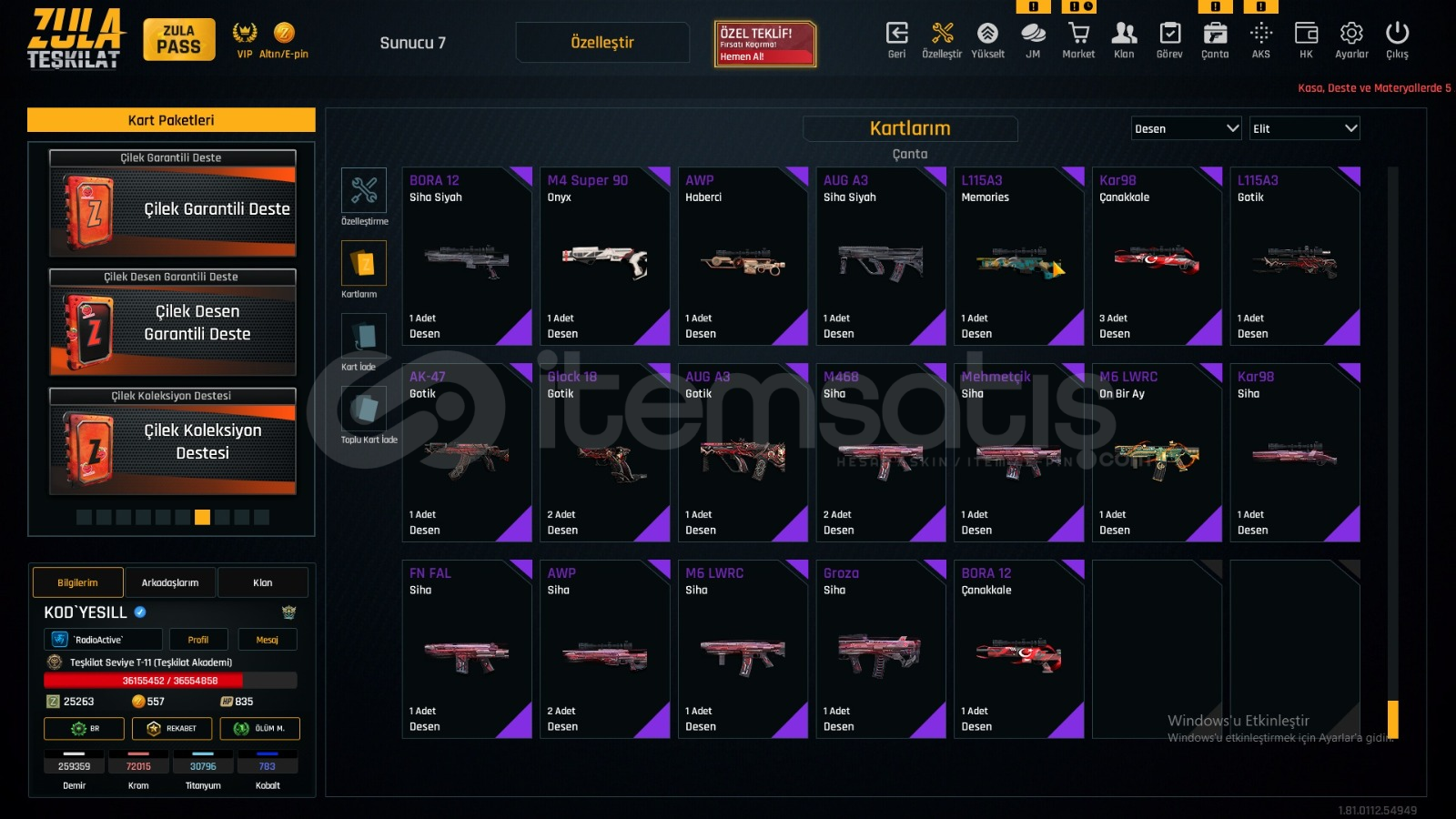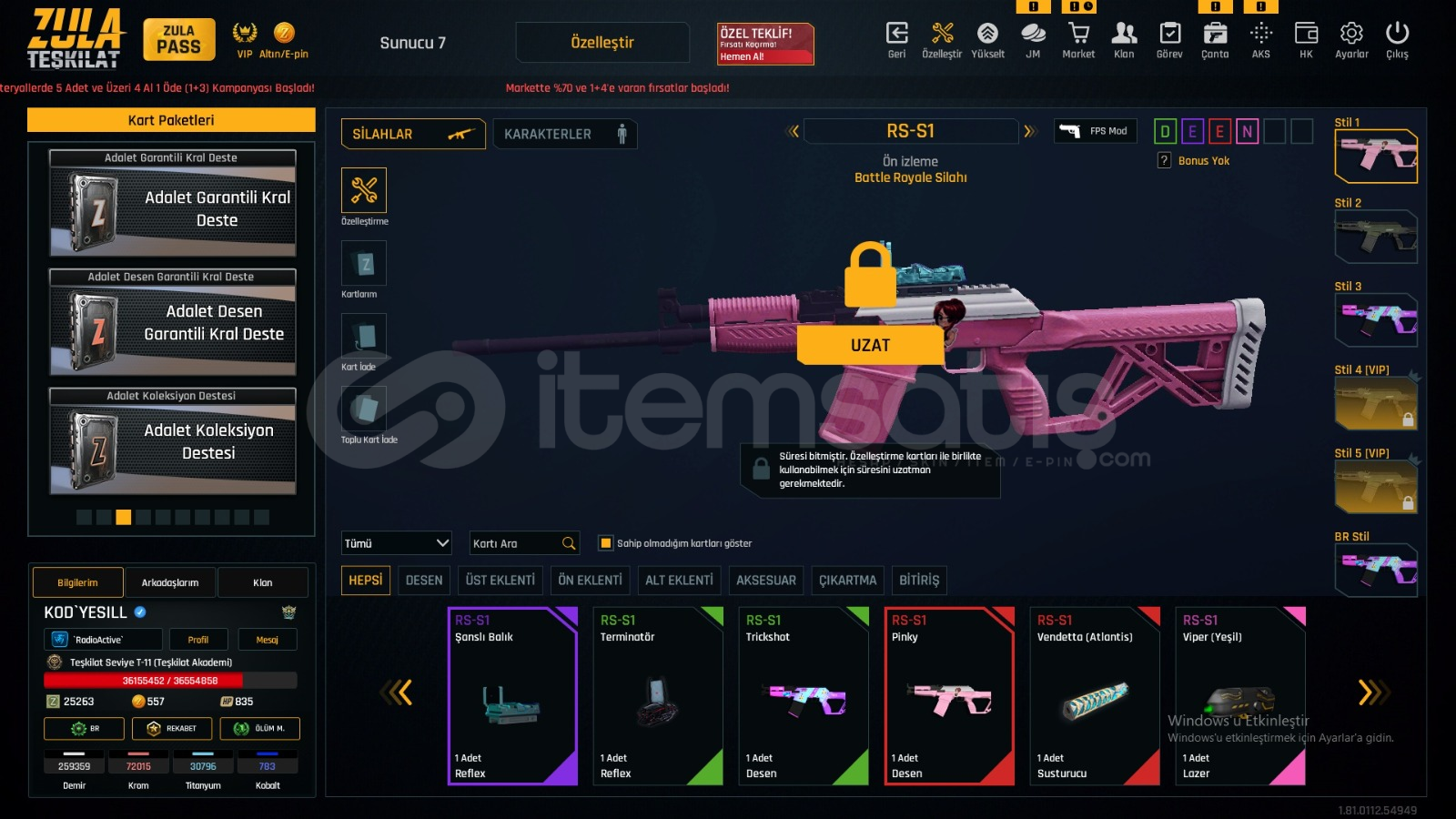 Hesap T-11 dirtdm - zümrütreko - altınbeta - zümrütTEK KULLANIMLIK TAKMA AD 8 ADETİSTATİSTİK SIFIRLAMA 2 ADETSINIRSIZ SİLAH MTP-76AUG A3AK-47P90MehmetçikTar-21kar98L115A3BORA 12DSR-1Cheytac m200Desert EagleKarambitGölgeikili BombaSINIRSIZ EKSTRALARHIZLI ATES 5DOKUNULMAZLIK 1HIZLI DORDURMA 25HIZLI CANLANMA 25SINIRSIZ KARAKTERLER ELENA ShahramAzad karaSahin Kılıç karakter ifadesiShahram - robotShahram - Kumuflaj - takım...