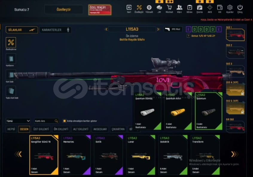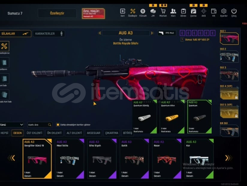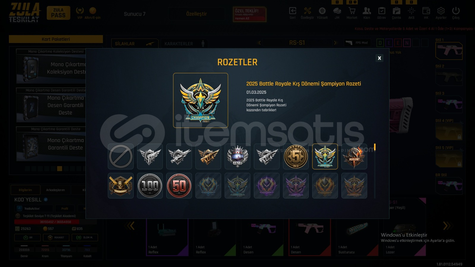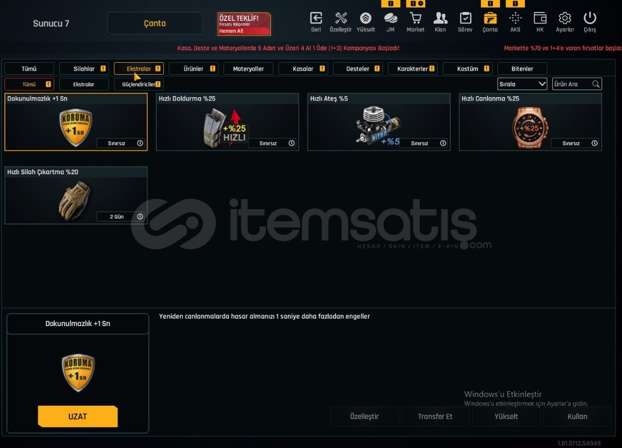 Hesap T-11 dirtdm - zümrütreko - altınbeta - zümrütTEK KULLANIMLIK TAKMA AD 8 ADETİSTATİSTİK SIFIRLAMA 2 ADETSINIRSIZ SİLAH MTP-76AUG A3AK-47P90MehmetçikTar-21kar98L115A3BORA 12DSR-1Cheytac m200Desert EagleKarambitGölgeikili BombaSINIRSIZ EKSTRALARHIZLI ATES 5DOKUNULMAZLIK 1HIZLI DORDURMA 25HIZLI CANLANMA 25SINIRSIZ KARAKTERLER ELENA ShahramAzad karaSahin Kılıç karakter ifadesiShahram - robotShahram - Kumuflaj - takım...