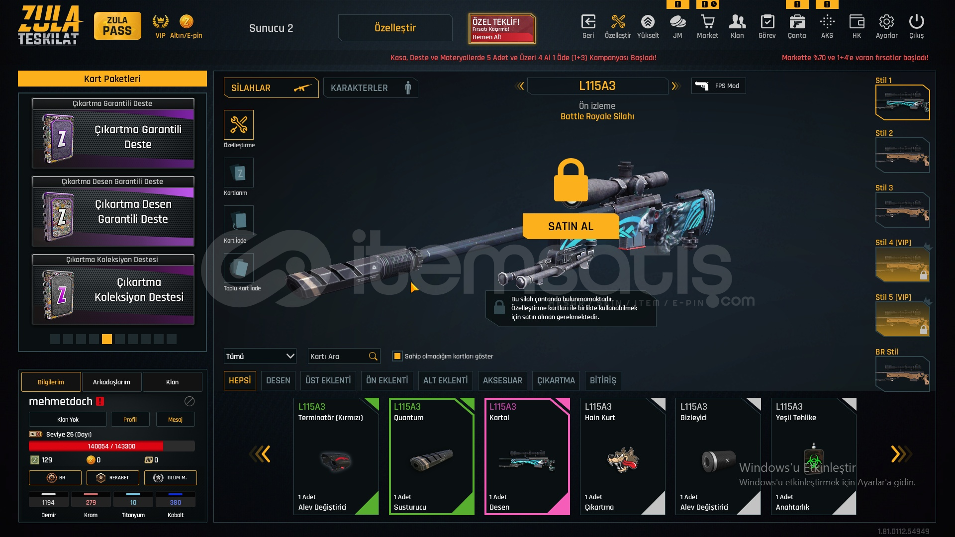 ⭐️TEL MAİL DEĞİŞEN L115A3 QUANTUMLU HESAP⭐️LVL- 26⭐️+6 KELEBEK⭐️+4 İKİLİ BOMBA⭐️+3 FAMAS⭐️+1 KAR98⭐️MAİLİ DEĞİŞİYOR⭐️TELEFON NUMARASI DEĞİŞİYOR