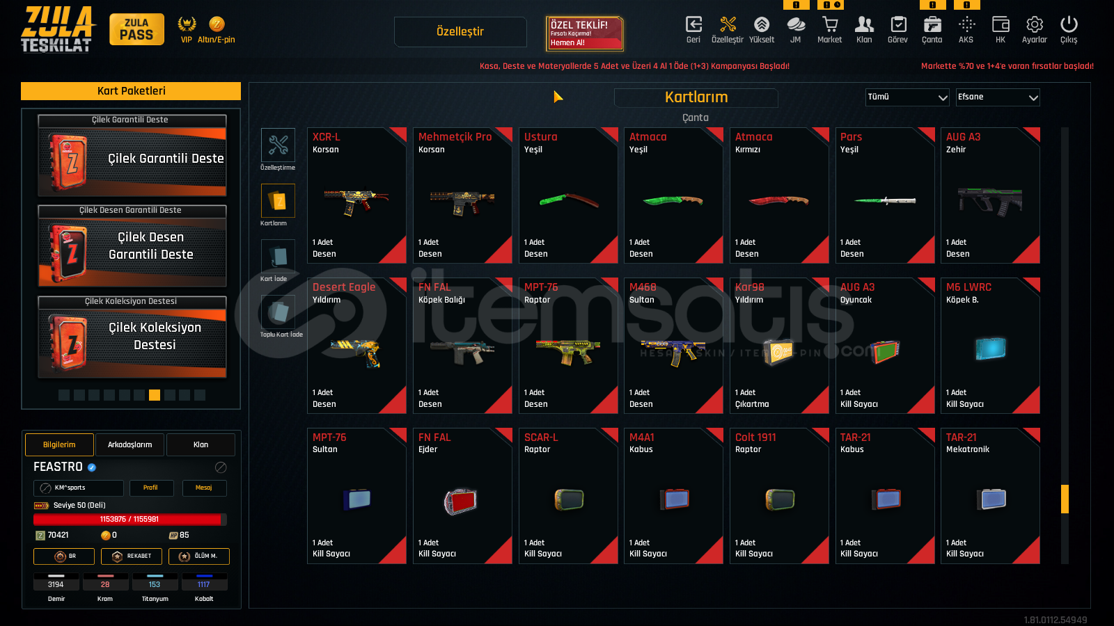 -2019 kurulum 50 seviye hesap mail değişecektir üstünüze alacaksınız.-Tertemiz hesap satlık güvenceli -Yazılandan farklı çıkarsa iade olumlu-Cep telefonu eski numaram kullanılamadığı için pasif halde mail size geçecek.ÖZELLİKLE -USTURA +4-M468 +3-KELEBEK +4-DİKİŞTUTMAZ +1-DEAGLE +3-İKİLİ BOMBA +4-M4A1 +1-SCAR-L +1-AUG A3 +4-M93R +33 ADET HATTRİCK KASAS...