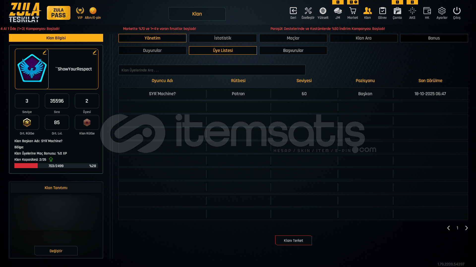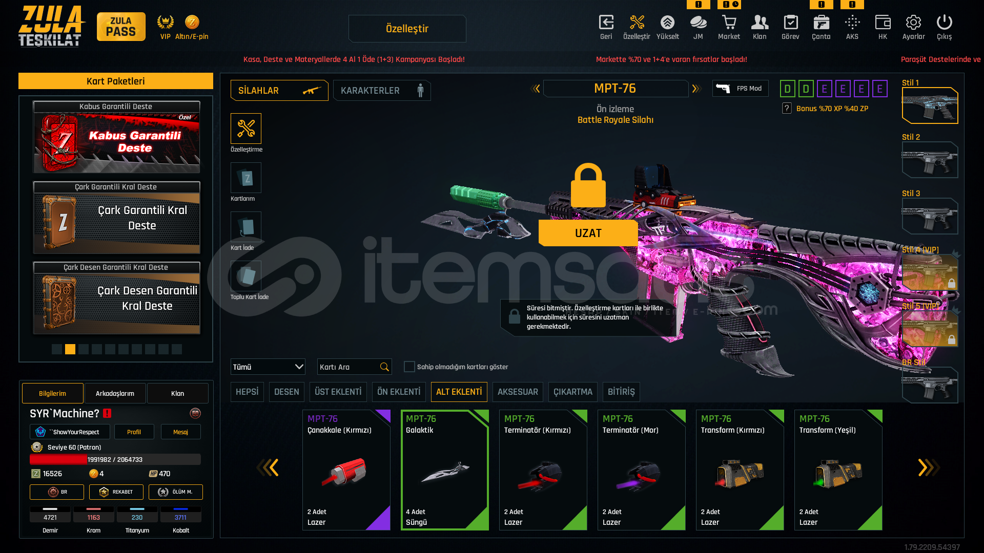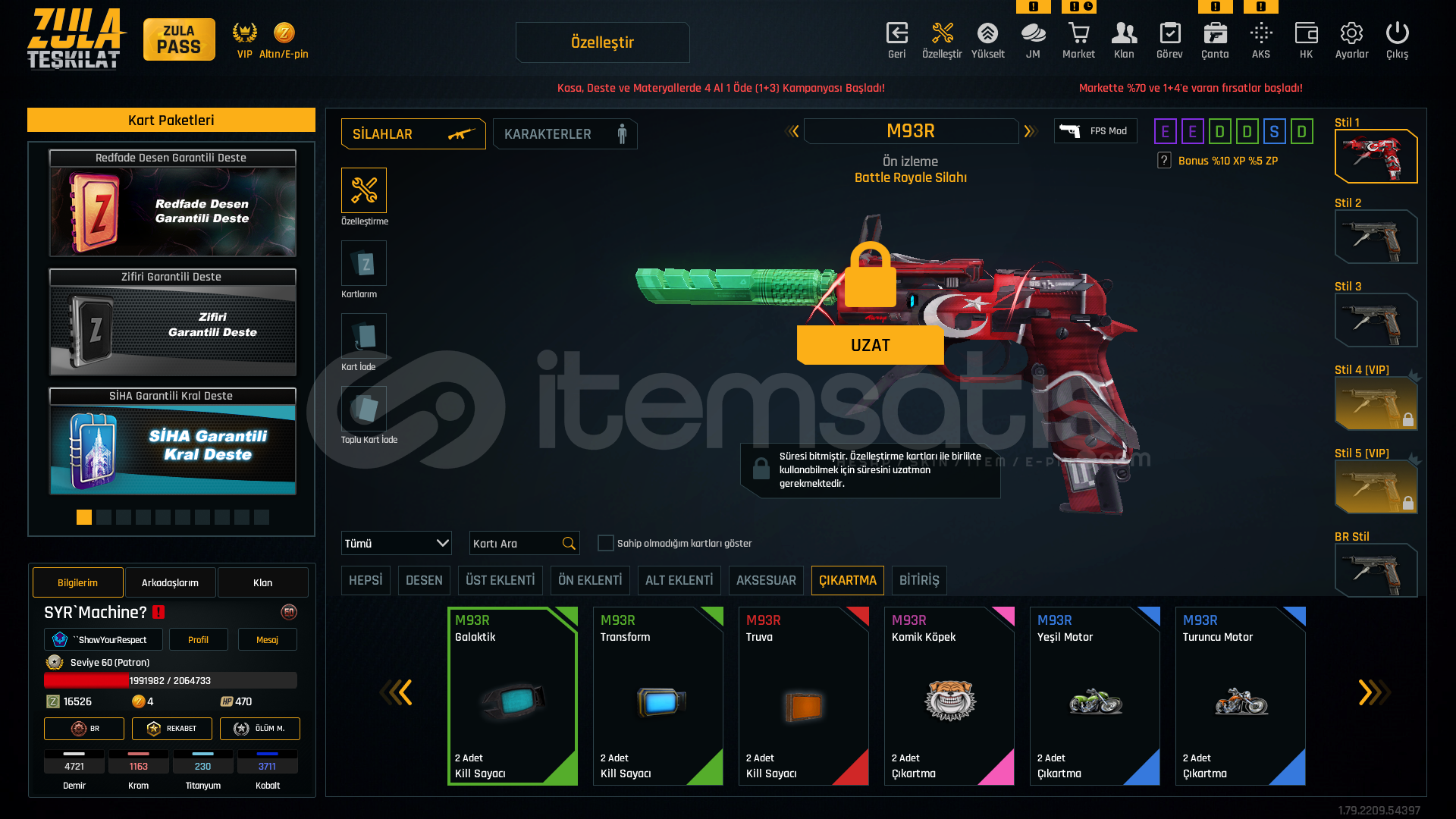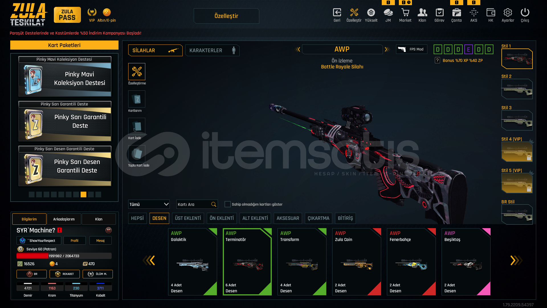 oyunu bıraktıgım için satmaktayımhesabın tel mail saglamdır devredilecektirlogolu klan ile verecegim alan kişiyeSınırsız +5 awp +7 kelebek+6 kar98+6 mpt76+6 ikili bomba+6 m93r+6 groza+6 karambit+6 l115a3300-400 arası efsanevi180-200 arası destansı37 adet elit kart bulunmaktadır.