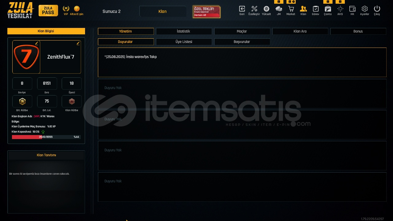 KLAN İSMİ : ZenithFlux`7 İSİME UYGUN LOGOLU AĞIR DEVRET :D KLAN SIRA 8000 LERDE NAMLI KLANOYUNDAN ARKADAŞ EKLERSİNİZ KLANA KATILIRSINIZ VE BENDE DEVREDİRİM KLAN SAFRANBOLU,FAVELA,DÜĞÜN SALONU,ÇİN BAHÇELERİ,GAZİANTEP HARİTALARINDA 1.DİRÇOK UCUZA VERİYORUM ACİL PARA SIKINTIM VAR
